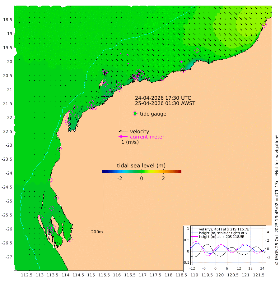 4cm/s 55T +12cm/s rms + 5cm/s -173T. NWSBAR 206m 3cm/s 43T +22cm/s rms + 10cm/s -148T. TAN100 109m 9cm/s 105T +11cm/s rms + 8cm/s -129T. PIL200 208m 13cm/s 127T +13cm/s rms + 7cm/s -137T. PIL100 105m 16cm/s 131T +12cm/s rms + 2cm/s -92T. PIL050 55m 3cm/s 60T +18cm/s rms + 4cm/s -149T. NRSNIN 61m 22cm/s 127T +6cm/s rms + 3cm/s 112T. NW Shelf M6 65m -28cm Withnell Point -35cm Denham -32cm Shark Bay (Inr Bn) -38cm Shark Bay -29cm Useless Loop 7cm Hamelin Pool -25cm Carnarvon -13cm Cape Cuvier -11cm Coral Bay -10cm Norwegian Bay -16cm Badjirrajirra -10cm Tantabiddi -15cm Point Murat -16cm Exmouth -11cm Learmonth -9cm Y Island -9cm North Muiron Island -7cm Roller -7cm Ashburton North -8cm Onslow (Beadon Creek) -8cm Thevenard Island -9cm Large Island -13cm North Sandy Island -8cm Barrow Island (Wapet Landing) -15cm Barrow Island (Tanker Mooring) 4cm Withnell Bay -1cm Trimouille Island -8cm North West Island -2cm Fortescue Road 2cm Steamboat Island 4cm Sholl Island 3cm Fairway Beacon 5cm Mawby Island 4cm Dampier (King Bay) -1cm Cape Legendre 0cm Hauy Island 7cm Port Walcott (Cape Lambert) 6cm Depuch Island 18cm Port Hedland 28cm Bedout Island 91cm Lagrange Bay