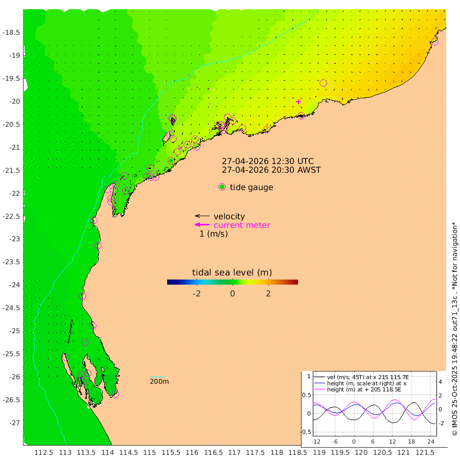 2cm/s -19T +12cm/s rms + 5cm/s -173T. NWSBAR 206m 0cm/s 162T +22cm/s rms + 10cm/s -148T. TAN100 109m 2cm/s 92T +11cm/s rms + 8cm/s -129T. PIL200 208m 3cm/s 92T +13cm/s rms + 7cm/s -137T. PIL100 105m 4cm/s 93T +12cm/s rms + 2cm/s -92T. PIL050 55m 0cm/s -3T +18cm/s rms + 4cm/s -149T. NRSNIN 61m 6cm/s -46T +6cm/s rms + 3cm/s 112T. NW Shelf M6 65m 12cm Withnell Point 9cm Denham 9cm Shark Bay (Inr Bn) 10cm Shark Bay 5cm Useless Loop -7cm Hamelin Pool 20cm Carnarvon 14cm Cape Cuvier 14cm Coral Bay 16cm Norwegian Bay 40cm Badjirrajirra 19cm Tantabiddi 29cm Point Murat 35cm Exmouth 44cm Learmonth 31cm Y Island 23cm North Muiron Island 28cm Roller 33cm Ashburton North 36cm Onslow (Beadon Creek) 35cm Thevenard Island 32cm Large Island 63cm North Sandy Island 51cm Barrow Island (Wapet Landing) 63cm Barrow Island (Tanker Mooring) 73cm Withnell Bay 46cm Trimouille Island 41cm North West Island 41cm Fortescue Road 62cm Steamboat Island 66cm Sholl Island 70cm Fairway Beacon 72cm Mawby Island 73cm Dampier (King Bay) 79cm Cape Legendre 80cm Hauy Island 91cm Port Walcott (Cape Lambert) 94cm Depuch Island 112cm Port Hedland 103cm Bedout Island 85cm Lagrange Bay