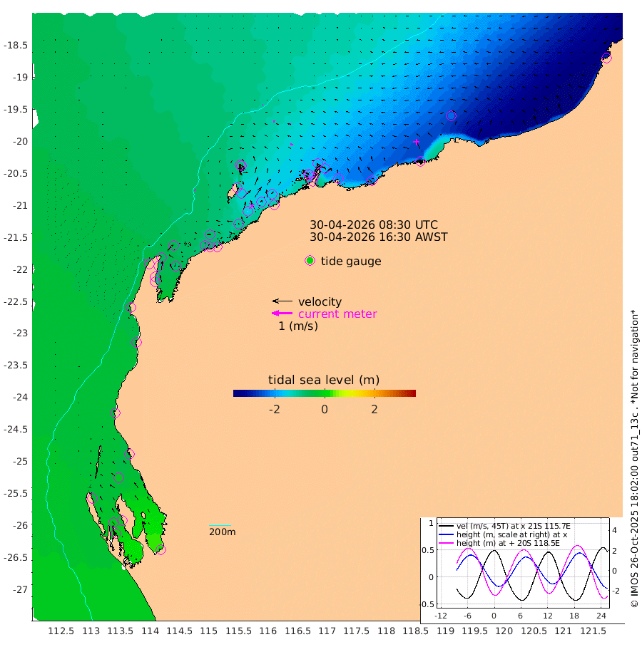 5cm/s 123T +12cm/s rms + 5cm/s -173T. NWSBAR 206m 5cm/s -138T +22cm/s rms + 10cm/s -148T. TAN100 109m 3cm/s -84T +11cm/s rms + 8cm/s -129T. PIL200 208m 7cm/s -81T +13cm/s rms + 7cm/s -137T. PIL100 105m 10cm/s -86T +12cm/s rms + 2cm/s -92T. PIL050 55m 4cm/s -137T +18cm/s rms + 4cm/s -149T. NRSNIN 61m 10cm/s -75T +6cm/s rms + 3cm/s 112T. NW Shelf M6 65m -36cm Withnell Point -17cm Denham -15cm Shark Bay (Inr Bn) -17cm Shark Bay -1cm Useless Loop 21cm Hamelin Pool -56cm Carnarvon -46cm Cape Cuvier -49cm Coral Bay -51cm Norwegian Bay -98cm Badjirrajirra -56cm Tantabiddi -76cm Point Murat -88cm Exmouth -106cm Learmonth -83cm Y Island -67cm North Muiron Island -80cm Roller -86cm Ashburton North -92cm Onslow (Beadon Creek) -89cm Thevenard Island -106cm Large Island -154cm North Sandy Island -121cm Barrow Island (Wapet Landing) -148cm Barrow Island (Tanker Mooring) -166cm Withnell Bay -122cm Trimouille Island -98cm North West Island -121cm Fortescue Road -153cm Steamboat Island -149cm Sholl Island -163cm Fairway Beacon -165cm Mawby Island -166cm Dampier (King Bay) -172cm Cape Legendre -175cm Hauy Island -203cm Port Walcott (Cape Lambert) -221cm Depuch Island -248cm Port Hedland -226cm Bedout Island -282cm Lagrange Bay