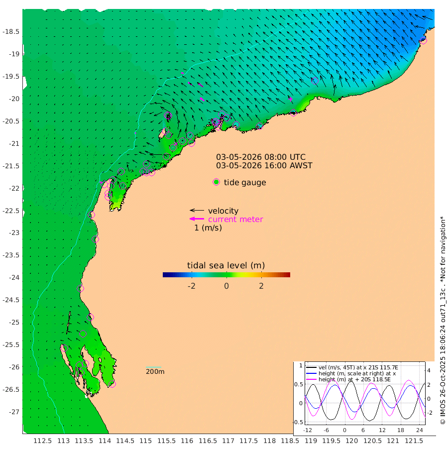 8cm/s -145T +12cm/s rms + 5cm/s -173T. NWSBAR 206m 12cm/s -138T +22cm/s rms + 10cm/s -148T. TAN100 109m 18cm/s -75T +11cm/s rms + 8cm/s -129T. PIL200 208m 31cm/s -56T +13cm/s rms + 7cm/s -137T. PIL100 105m 38cm/s -54T +12cm/s rms + 2cm/s -92T. PIL050 55m 13cm/s -133T +18cm/s rms + 4cm/s -149T. NRSNIN 61m 41cm/s -53T +6cm/s rms + 3cm/s 112T. NW Shelf M6 65m -12cm Withnell Point 19cm Denham 20cm Shark Bay (Inr Bn) 16cm Shark Bay 31cm Useless Loop 21cm Hamelin Pool -35cm Carnarvon -43cm Cape Cuvier -46cm Coral Bay -48cm Norwegian Bay -48cm Badjirrajirra -51cm Tantabiddi -46cm Point Murat -46cm Exmouth -51cm Learmonth -57cm Y Island -54cm North Muiron Island -64cm Roller -64cm Ashburton North -62cm Onslow (Beadon Creek) -66cm Thevenard Island -45cm Large Island -75cm North Sandy Island -73cm Barrow Island (Wapet Landing) -63cm Barrow Island (Tanker Mooring) -112cm Withnell Bay -75cm Trimouille Island -67cm North West Island -57cm Fortescue Road -101cm Steamboat Island -76cm Sholl Island -107cm Fairway Beacon -110cm Mawby Island -111cm Dampier (King Bay) -112cm Cape Legendre -103cm Hauy Island -124cm Port Walcott (Cape Lambert) -141cm Depuch Island -153cm Port Hedland -163cm Bedout Island -271cm Lagrange Bay