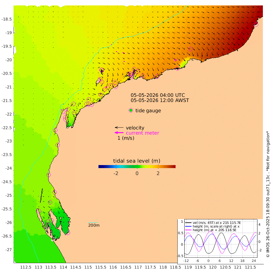 2cm/s -9T +12cm/s rms + 5cm/s -173T. NWSBAR 206m 5cm/s 39T +22cm/s rms + 10cm/s -148T. TAN100 109m 7cm/s 105T +11cm/s rms + 8cm/s -129T. PIL200 208m 10cm/s 110T +13cm/s rms + 7cm/s -137T. PIL100 105m 13cm/s 110T +12cm/s rms + 2cm/s -92T. PIL050 55m 5cm/s 42T +18cm/s rms + 4cm/s -149T. NRSNIN 61m 23cm/s 111T +6cm/s rms + 3cm/s 112T. NW Shelf M6 65m 47cm Withnell Point 39cm Denham 38cm Shark Bay (Inr Bn) 44cm Shark Bay 31cm Useless Loop -10cm Hamelin Pool 63cm Carnarvon 54cm Cape Cuvier 59cm Coral Bay 59cm Norwegian Bay 103cm Badjirrajirra 66cm Tantabiddi 84cm Point Murat 95cm Exmouth 101cm Learmonth 98cm Y Island 80cm North Muiron Island 94cm Roller 94cm Ashburton North 100cm Onslow (Beadon Creek) 98cm Thevenard Island 138cm Large Island 154cm North Sandy Island 125cm Barrow Island (Wapet Landing) 147cm Barrow Island (Tanker Mooring) 169cm Withnell Bay 119cm Trimouille Island 106cm North West Island 156cm Fortescue Road 160cm Steamboat Island 145cm Sholl Island 165cm Fairway Beacon 167cm Mawby Island 169cm Dampier (King Bay) 165cm Cape Legendre 173cm Hauy Island 202cm Port Walcott (Cape Lambert) 222cm Depuch Island 245cm Port Hedland 251cm Bedout Island 388cm Lagrange Bay