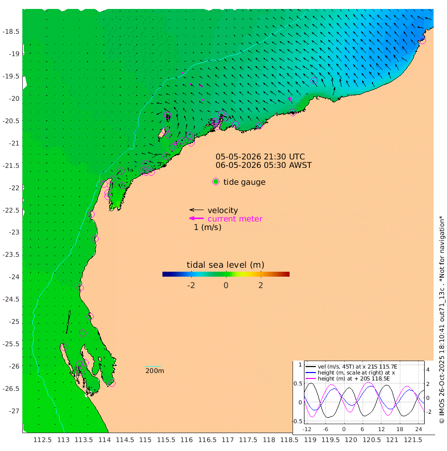 5cm/s -152T +12cm/s rms + 5cm/s -173T. NWSBAR 206m 3cm/s -141T +22cm/s rms + 10cm/s -148T. TAN100 109m 11cm/s -74T +11cm/s rms + 8cm/s -129T. PIL200 208m 16cm/s -58T +13cm/s rms + 7cm/s -137T. PIL100 105m 20cm/s -56T +12cm/s rms + 2cm/s -92T. PIL050 55m 2cm/s -129T +18cm/s rms + 4cm/s -149T. NRSNIN 61m 27cm/s -62T +6cm/s rms + 3cm/s 112T. NW Shelf M6 65m -1cm Withnell Point -1cm Denham -5cm Shark Bay (Inr Bn) -3cm Shark Bay -7cm Useless Loop -9cm Hamelin Pool -6cm Carnarvon -10cm Cape Cuvier -13cm Coral Bay -13cm Norwegian Bay -31cm Badjirrajirra -19cm Tantabiddi -23cm Point Murat -28cm Exmouth -34cm Learmonth -36cm Y Island -27cm North Muiron Island -37cm Roller -35cm Ashburton North -37cm Onslow (Beadon Creek) -37cm Thevenard Island -38cm Large Island -58cm North Sandy Island -50cm Barrow Island (Wapet Landing) -53cm Barrow Island (Tanker Mooring) -83cm Withnell Bay -43cm Trimouille Island -43cm North West Island -55cm Fortescue Road -73cm Steamboat Island -63cm Sholl Island -80cm Fairway Beacon -85cm Mawby Island -83cm Dampier (King Bay) -79cm Cape Legendre -83cm Hauy Island -102cm Port Walcott (Cape Lambert) -113cm Depuch Island -133cm Port Hedland -152cm Bedout Island -248cm Lagrange Bay