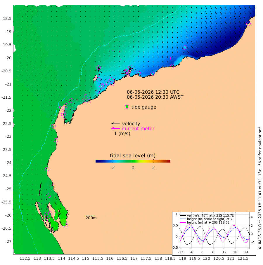 6cm/s 85T +12cm/s rms + 5cm/s -173T. NWSBAR 206m 0cm/s -158T +22cm/s rms + 10cm/s -148T. TAN100 109m 5cm/s 108T +11cm/s rms + 8cm/s -129T. PIL200 208m 10cm/s 140T +13cm/s rms + 7cm/s -137T. PIL100 105m 12cm/s 151T +12cm/s rms + 2cm/s -92T. PIL050 55m 1cm/s -172T +18cm/s rms + 4cm/s -149T. NRSNIN 61m 9cm/s 169T +6cm/s rms + 3cm/s 112T. NW Shelf M6 65m -43cm Withnell Point -33cm Denham -27cm Shark Bay (Inr Bn) -34cm Shark Bay -16cm Useless Loop 23cm Hamelin Pool -61cm Carnarvon -44cm Cape Cuvier -46cm Coral Bay -49cm Norwegian Bay -97cm Badjirrajirra -51cm Tantabiddi -75cm Point Murat -88cm Exmouth -94cm Learmonth -82cm Y Island -64cm North Muiron Island -72cm Roller -75cm Ashburton North -82cm Onslow (Beadon Creek) -78cm Thevenard Island -159cm Large Island -145cm North Sandy Island -105cm Barrow Island (Wapet Landing) -143cm Barrow Island (Tanker Mooring) -130cm Withnell Bay -103cm Trimouille Island -84cm North West Island -173cm Fortescue Road -133cm Steamboat Island -135cm Sholl Island -130cm Fairway Beacon -128cm Mawby Island -131cm Dampier (King Bay) -126cm Cape Legendre -147cm Hauy Island -161cm Port Walcott (Cape Lambert) -180cm Depuch Island -190cm Port Hedland -167cm Bedout Island -291cm Lagrange Bay