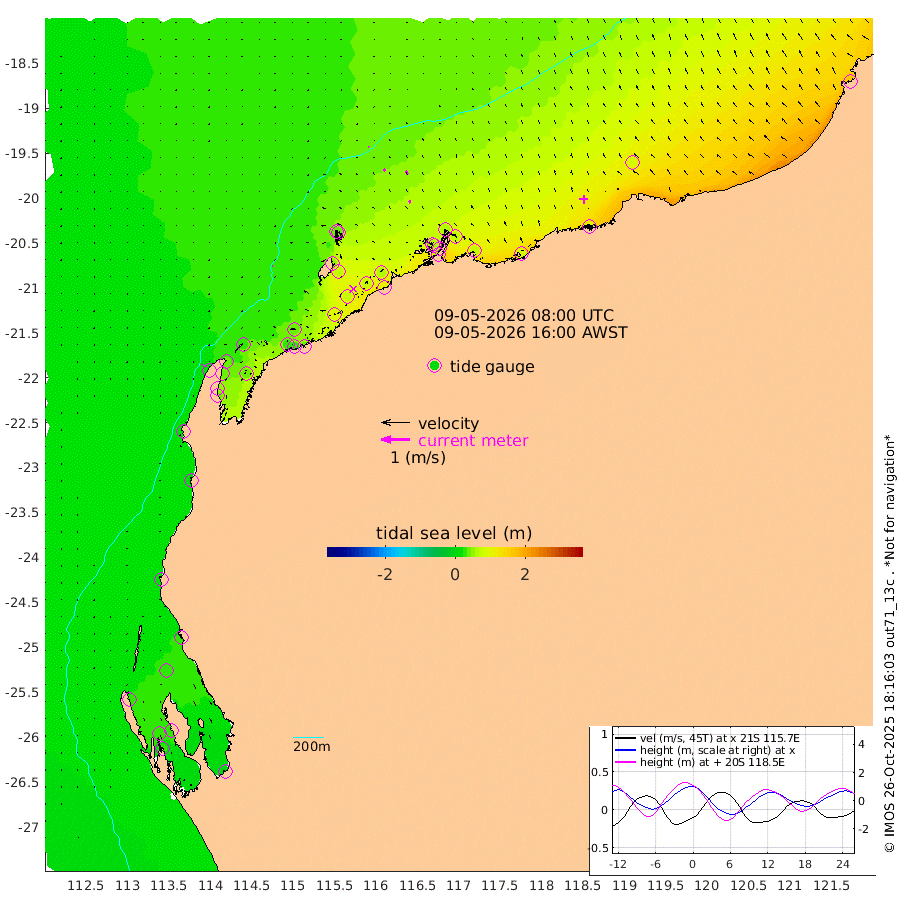2cm/s -77T +12cm/s rms + 5cm/s -173T. NWSBAR 206m 4cm/s -140T +22cm/s rms + 10cm/s -148T. TAN100 109m 3cm/s -61T +11cm/s rms + 8cm/s -129T. PIL200 208m 9cm/s -44T +13cm/s rms + 7cm/s -137T. PIL100 105m 10cm/s -35T +12cm/s rms + 2cm/s -92T. PIL050 55m 4cm/s -129T +18cm/s rms + 4cm/s -149T. NRSNIN 61m 14cm/s -31T +6cm/s rms + 3cm/s 112T. NW Shelf M6 65m 24cm Withnell Point 31cm Denham 30cm Shark Bay (Inr Bn) 33cm Shark Bay 30cm Useless Loop -2cm Hamelin Pool 28cm Carnarvon 16cm Cape Cuvier 17cm Coral Bay 20cm Norwegian Bay 49cm Badjirrajirra 21cm Tantabiddi 36cm Point Murat 44cm Exmouth 44cm Learmonth 43cm Y Island 30cm North Muiron Island 33cm Roller 34cm Ashburton North 38cm Onslow (Beadon Creek) 36cm Thevenard Island 95cm Large Island 68cm North Sandy Island 50cm Barrow Island (Wapet Landing) 71cm Barrow Island (Tanker Mooring) 61cm Withnell Bay 42cm Trimouille Island 40cm North West Island 104cm Fortescue Road 62cm Steamboat Island 69cm Sholl Island 60cm Fairway Beacon 59cm Mawby Island 61cm Dampier (King Bay) 57cm Cape Legendre 73cm Hauy Island 76cm Port Walcott (Cape Lambert) 83cm Depuch Island 91cm Port Hedland 84cm Bedout Island 160cm Lagrange Bay