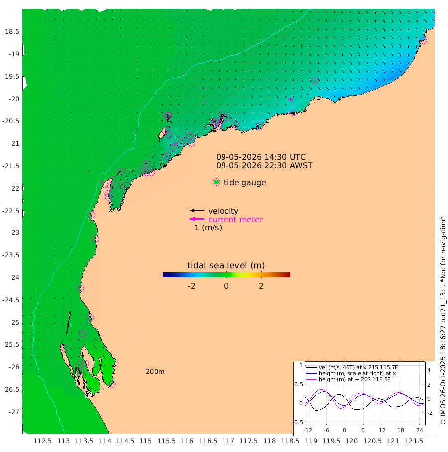 2cm/s 88T +12cm/s rms + 5cm/s -173T. NWSBAR 206m 1cm/s -147T +22cm/s rms + 10cm/s -148T. TAN100 109m 3cm/s 103T +11cm/s rms + 8cm/s -129T. PIL200 208m 5cm/s 135T +13cm/s rms + 7cm/s -137T. PIL100 105m 7cm/s 147T +12cm/s rms + 2cm/s -92T. PIL050 55m 1cm/s -155T +18cm/s rms + 4cm/s -149T. NRSNIN 61m 11cm/s 163T +6cm/s rms + 3cm/s 112T. NW Shelf M6 65m -30cm Withnell Point -24cm Denham -19cm Shark Bay (Inr Bn) -26cm Shark Bay -12cm Useless Loop 15cm Hamelin Pool -42cm Carnarvon -30cm Cape Cuvier -31cm Coral Bay -34cm Norwegian Bay -58cm Badjirrajirra -33cm Tantabiddi -46cm Point Murat -53cm Exmouth -51cm Learmonth -52cm Y Island -40cm North Muiron Island -44cm Roller -45cm Ashburton North -48cm Onslow (Beadon Creek) -47cm Thevenard Island -88cm Large Island -77cm North Sandy Island -59cm Barrow Island (Wapet Landing) -78cm Barrow Island (Tanker Mooring) -69cm Withnell Bay -46cm Trimouille Island -48cm North West Island -102cm Fortescue Road -73cm Steamboat Island -70cm Sholl Island -70cm Fairway Beacon -70cm Mawby Island -70cm Dampier (King Bay) -70cm Cape Legendre -78cm Hauy Island -82cm Port Walcott (Cape Lambert) -90cm Depuch Island -94cm Port Hedland -82cm Bedout Island -148cm Lagrange Bay