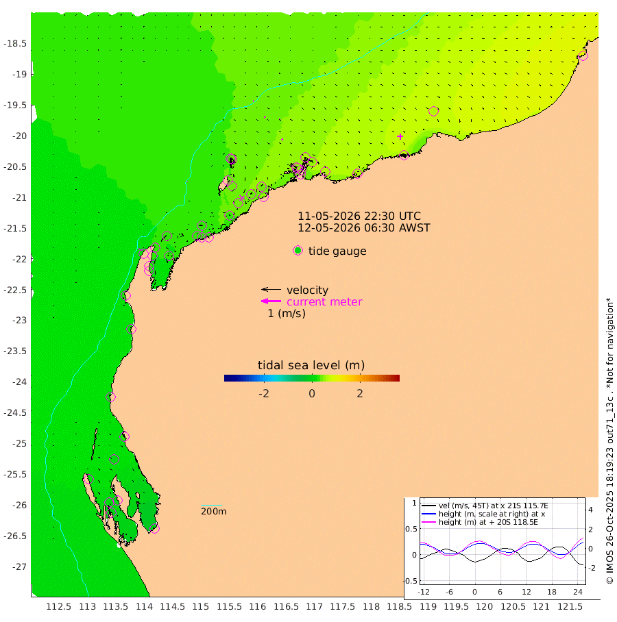 2cm/s -22T +12cm/s rms + 5cm/s -173T. NWSBAR 206m 3cm/s 42T +22cm/s rms + 10cm/s -148T. TAN100 109m 2cm/s 105T +11cm/s rms + 8cm/s -129T. PIL200 208m 6cm/s 118T +13cm/s rms + 7cm/s -137T. PIL100 105m 7cm/s 109T +12cm/s rms + 2cm/s -92T. PIL050 55m 4cm/s 47T +18cm/s rms + 4cm/s -149T. NRSNIN 61m 2cm/s 27T +6cm/s rms + 3cm/s 112T. NW Shelf M6 65m 13cm Withnell Point 2cm Denham 1cm Shark Bay (Inr Bn) 1cm Shark Bay -6cm Useless Loop -11cm Hamelin Pool 23cm Carnarvon 18cm Cape Cuvier 19cm Coral Bay 23cm Norwegian Bay 32cm Badjirrajirra 21cm Tantabiddi 26cm Point Murat 29cm Exmouth 30cm Learmonth 31cm Y Island 25cm North Muiron Island 28cm Roller 30cm Ashburton North 31cm Onslow (Beadon Creek) 31cm Thevenard Island 32cm Large Island 45cm North Sandy Island 38cm Barrow Island (Wapet Landing) 42cm Barrow Island (Tanker Mooring) 52cm Withnell Bay 37cm Trimouille Island 24cm North West Island 47cm Fortescue Road 40cm Steamboat Island 41cm Sholl Island 51cm Fairway Beacon 50cm Mawby Island 51cm Dampier (King Bay) 58cm Cape Legendre 51cm Hauy Island 59cm Port Walcott (Cape Lambert) 66cm Depuch Island 71cm Port Hedland 67cm Bedout Island 103cm Lagrange Bay