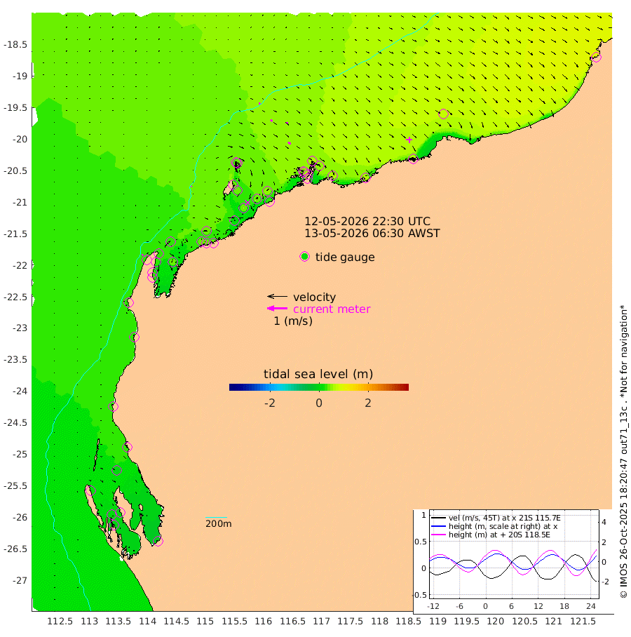 3cm/s 28T +12cm/s rms + 5cm/s -173T. NWSBAR 206m 5cm/s 41T +22cm/s rms + 10cm/s -148T. TAN100 109m 7cm/s 106T +11cm/s rms + 8cm/s -129T. PIL200 208m 13cm/s 122T +13cm/s rms + 7cm/s -137T. PIL100 105m 15cm/s 120T +12cm/s rms + 2cm/s -92T. PIL050 55m 6cm/s 48T +18cm/s rms + 4cm/s -149T. NRSNIN 61m 9cm/s 120T +6cm/s rms + 3cm/s 112T. NW Shelf M6 65m 16cm Withnell Point 4cm Denham 4cm Shark Bay (Inr Bn) 4cm Shark Bay -3cm Useless Loop -10cm Hamelin Pool 27cm Carnarvon 26cm Cape Cuvier 27cm Coral Bay 31cm Norwegian Bay 34cm Badjirrajirra 29cm Tantabiddi 30cm Point Murat 32cm Exmouth 31cm Learmonth 37cm Y Island 32cm North Muiron Island 35cm Roller 36cm Ashburton North 37cm Onslow (Beadon Creek) 38cm Thevenard Island 19cm Large Island 39cm North Sandy Island 42cm Barrow Island (Wapet Landing) 38cm Barrow Island (Tanker Mooring) 59cm Withnell Bay 43cm Trimouille Island 30cm North West Island 30cm Fortescue Road 48cm Steamboat Island 41cm Sholl Island 56cm Fairway Beacon 56cm Mawby Island 57cm Dampier (King Bay) 67cm Cape Legendre 52cm Hauy Island 62cm Port Walcott (Cape Lambert) 65cm Depuch Island 74cm Port Hedland 77cm Bedout Island 95cm Lagrange Bay