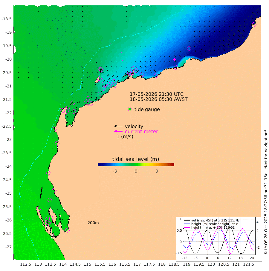 5cm/s 137T +12cm/s rms + 5cm/s -173T. NWSBAR 206m 2cm/s 32T +22cm/s rms + 10cm/s -148T. TAN100 109m 2cm/s -62T +11cm/s rms + 8cm/s -129T. PIL200 208m 2cm/s -123T +13cm/s rms + 7cm/s -137T. PIL100 105m 5cm/s -111T +12cm/s rms + 2cm/s -92T. PIL050 55m 3cm/s 52T +18cm/s rms + 4cm/s -149T. NRSNIN 61m 9cm/s -91T +6cm/s rms + 3cm/s 112T. NW Shelf M6 65m 1cm Withnell Point 1cm Denham 0cm Shark Bay (Inr Bn) 1cm Shark Bay 1cm Useless Loop -2cm Hamelin Pool -10cm Carnarvon -2cm Cape Cuvier -6cm Coral Bay -9cm Norwegian Bay -67cm Badjirrajirra -16cm Tantabiddi -41cm Point Murat -56cm Exmouth -68cm Learmonth -55cm Y Island -32cm North Muiron Island -46cm Roller -50cm Ashburton North -59cm Onslow (Beadon Creek) -53cm Thevenard Island -94cm Large Island -126cm North Sandy Island -90cm Barrow Island (Wapet Landing) -124cm Barrow Island (Tanker Mooring) -140cm Withnell Bay -86cm Trimouille Island -65cm North West Island -127cm Fortescue Road -133cm Steamboat Island -135cm Sholl Island -137cm Fairway Beacon -138cm Mawby Island -141cm Dampier (King Bay) -139cm Cape Legendre -161cm Hauy Island -184cm Port Walcott (Cape Lambert) -205cm Depuch Island -238cm Port Hedland -243cm Bedout Island -340cm Lagrange Bay