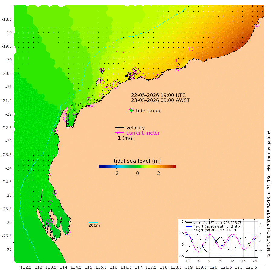 3cm/s -25T +12cm/s rms + 5cm/s -173T. NWSBAR 206m 2cm/s 48T +22cm/s rms + 10cm/s -148T. TAN100 109m 3cm/s 92T +11cm/s rms + 8cm/s -129T. PIL200 208m 4cm/s 89T +13cm/s rms + 7cm/s -137T. PIL100 105m 6cm/s 83T +12cm/s rms + 2cm/s -92T. PIL050 55m 3cm/s 47T +18cm/s rms + 4cm/s -149T. NRSNIN 61m 4cm/s 25T +6cm/s rms + 3cm/s 112T. NW Shelf M6 65m -2cm Withnell Point -18cm Denham -19cm Shark Bay (Inr Bn) -22cm Shark Bay -28cm Useless Loop -14cm Hamelin Pool 17cm Carnarvon 13cm Cape Cuvier 15cm Coral Bay 21cm Norwegian Bay 54cm Badjirrajirra 20cm Tantabiddi 36cm Point Murat 45cm Exmouth 56cm Learmonth 43cm Y Island 30cm North Muiron Island 35cm Roller 42cm Ashburton North 47cm Onslow (Beadon Creek) 43cm Thevenard Island 88cm Large Island 89cm North Sandy Island 66cm Barrow Island (Wapet Landing) 88cm Barrow Island (Tanker Mooring) 96cm Withnell Bay 71cm Trimouille Island 44cm North West Island 109cm Fortescue Road 92cm Steamboat Island 103cm Sholl Island 95cm Fairway Beacon 95cm Mawby Island 97cm Dampier (King Bay) 100cm Cape Legendre 108cm Hauy Island 123cm Port Walcott (Cape Lambert) 129cm Depuch Island 155cm Port Hedland 142cm Bedout Island 220cm Lagrange Bay