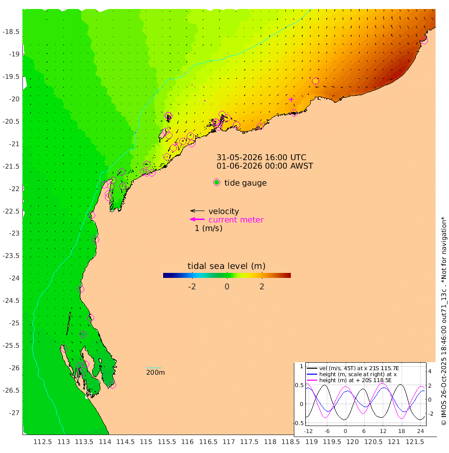 6cm/s -66T +12cm/s rms + 5cm/s -173T. NWSBAR 206m 1cm/s 66T +22cm/s rms + 10cm/s -148T. TAN100 109m 2cm/s -52T +11cm/s rms + 8cm/s -129T. PIL200 208m 4cm/s -17T +13cm/s rms + 7cm/s -137T. PIL100 105m 5cm/s 0T +12cm/s rms + 2cm/s -92T. PIL050 55m 1cm/s 27T +18cm/s rms + 4cm/s -149T. NRSNIN 61m 4cm/s 63T +6cm/s rms + 3cm/s 112T. NW Shelf M6 65m -4cm Withnell Point -21cm Denham -24cm Shark Bay (Inr Bn) -24cm Shark Bay -33cm Useless Loop -18cm Hamelin Pool 13cm Carnarvon 8cm Cape Cuvier 9cm Coral Bay 13cm Norwegian Bay 54cm Badjirrajirra 16cm Tantabiddi 35cm Point Murat 45cm Exmouth 61cm Learmonth 39cm Y Island 26cm North Muiron Island 35cm Roller 41cm Ashburton North 46cm Onslow (Beadon Creek) 42cm Thevenard Island 110cm Large Island 106cm North Sandy Island 70cm Barrow Island (Wapet Landing) 101cm Barrow Island (Tanker Mooring) 103cm Withnell Bay 74cm Trimouille Island 52cm North West Island 131cm Fortescue Road 101cm Steamboat Island 108cm Sholl Island 103cm Fairway Beacon 102cm Mawby Island 105cm Dampier (King Bay) 101cm Cape Legendre 124cm Hauy Island 138cm Port Walcott (Cape Lambert) 159cm Depuch Island 175cm Port Hedland 153cm Bedout Island 288cm Lagrange Bay