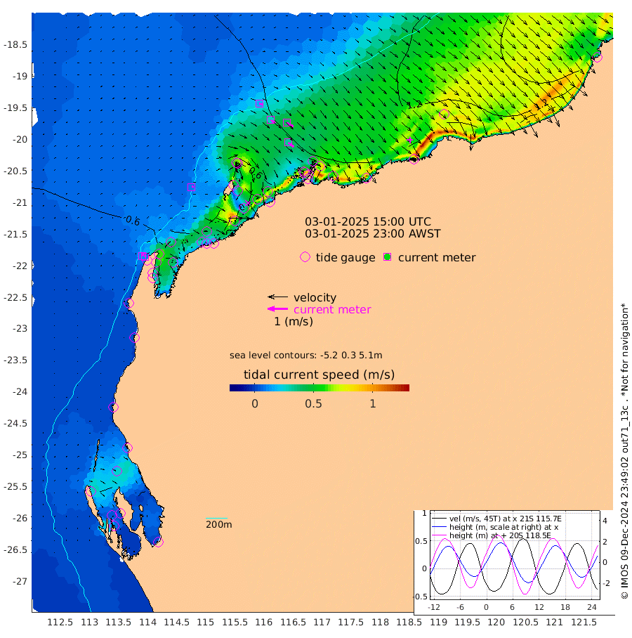 9cm/s 63T +12cm/s rms + 5cm/s -173T. NWSBAR 206m 11cm/s 40T +22cm/s rms + 10cm/s -148T. TAN100 109m 17cm/s 110T +11cm/s rms + 8cm/s -129T. PIL200 208m 27cm/s 126T +13cm/s rms + 7cm/s -137T. PIL100 105m 33cm/s 129T +12cm/s rms + 2cm/s -92T. PIL050 55m 10cm/s 45T +18cm/s rms + 4cm/s -149T. NRSNIN 61m 39cm/s 120T +6cm/s rms + 3cm/s 112T. NW Shelf M6 65m 29cm Withnell Point 15cm Denham 14cm Shark Bay (Inr Bn) 22cm Shark Bay 14cm Useless Loop -5cm Hamelin Pool 43cm Carnarvon 49cm Cape Cuvier 52cm Coral Bay 49cm Norwegian Bay 51cm Badjirrajirra 54cm Tantabiddi 50cm Point Murat 48cm Exmouth 45cm Learmonth 58cm Y Island 56cm North Muiron Island 61cm Roller 62cm Ashburton North 62cm Onslow (Beadon Creek) 64cm Thevenard Island 30cm Large Island 53cm North Sandy Island 66cm Barrow Island (Wapet Landing) 52cm Barrow Island (Tanker Mooring) 91cm Withnell Bay 52cm Trimouille Island 68cm North West Island 38cm Fortescue Road 92cm Steamboat Island 51cm Sholl Island 89cm Fairway Beacon 95cm Mawby Island 92cm Dampier (King Bay) 97cm Cape Legendre 79cm Hauy Island 97cm Port Walcott (Cape Lambert) 93cm Depuch Island 114cm Port Hedland 138cm Bedout Island 206cm Lagrange Bay