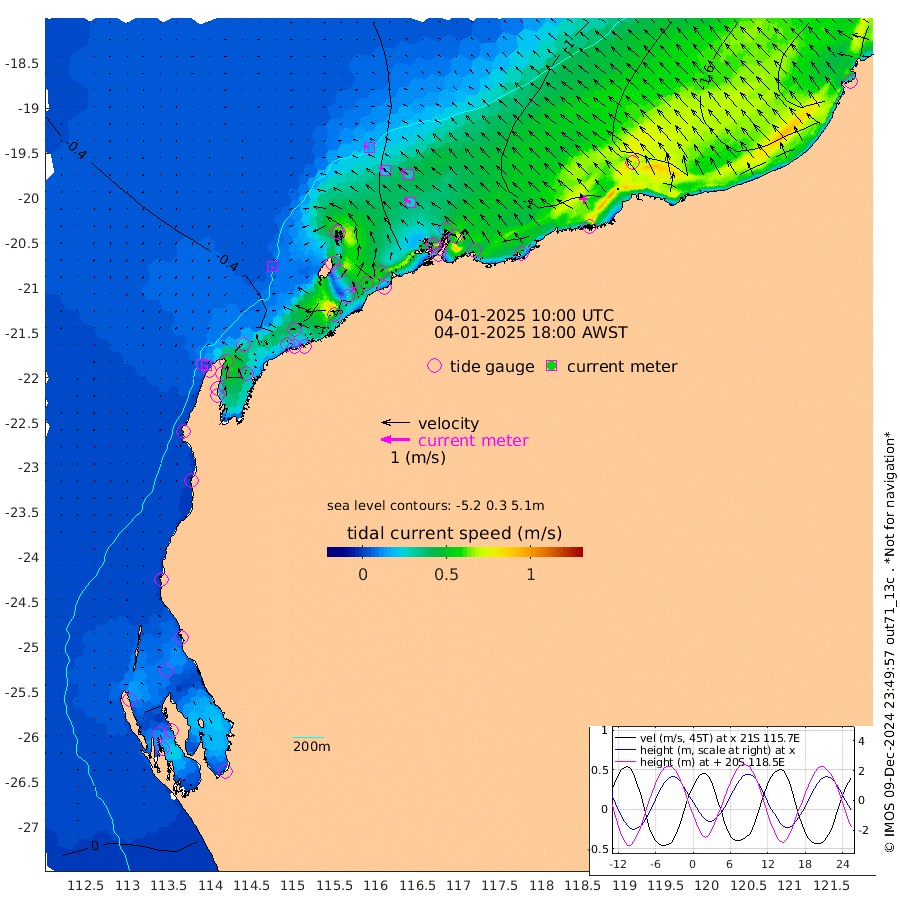 8cm/s -139T +12cm/s rms + 5cm/s -173T. NWSBAR 206m 5cm/s -137T +22cm/s rms + 10cm/s -148T. TAN100 109m 16cm/s -74T +11cm/s rms + 8cm/s -129T. PIL200 208m 23cm/s -57T +13cm/s rms + 7cm/s -137T. PIL100 105m 28cm/s -54T +12cm/s rms + 2cm/s -92T. PIL050 55m 5cm/s -128T +18cm/s rms + 4cm/s -149T. NRSNIN 61m 30cm/s -60T +6cm/s rms + 3cm/s 112T. NW Shelf M6 65m 0cm Withnell Point 12cm Denham 7cm Shark Bay (Inr Bn) 9cm Shark Bay 8cm Useless Loop -3cm Hamelin Pool -8cm Carnarvon -16cm Cape Cuvier -20cm Coral Bay -20cm Norwegian Bay -29cm Badjirrajirra -24cm Tantabiddi -24cm Point Murat -26cm Exmouth -32cm Learmonth -34cm Y Island -29cm North Muiron Island -35cm Roller -37cm Ashburton North -38cm Onslow (Beadon Creek) -39cm Thevenard Island -42cm Large Island -41cm North Sandy Island -48cm Barrow Island (Wapet Landing) -41cm Barrow Island (Tanker Mooring) -80cm Withnell Bay -45cm Trimouille Island -46cm North West Island -51cm Fortescue Road -75cm Steamboat Island -55cm Sholl Island -77cm Fairway Beacon -82cm Mawby Island -80cm Dampier (King Bay) -82cm Cape Legendre -77cm Hauy Island -93cm Port Walcott (Cape Lambert) -96cm Depuch Island -121cm Port Hedland -135cm Bedout Island -239cm Lagrange Bay