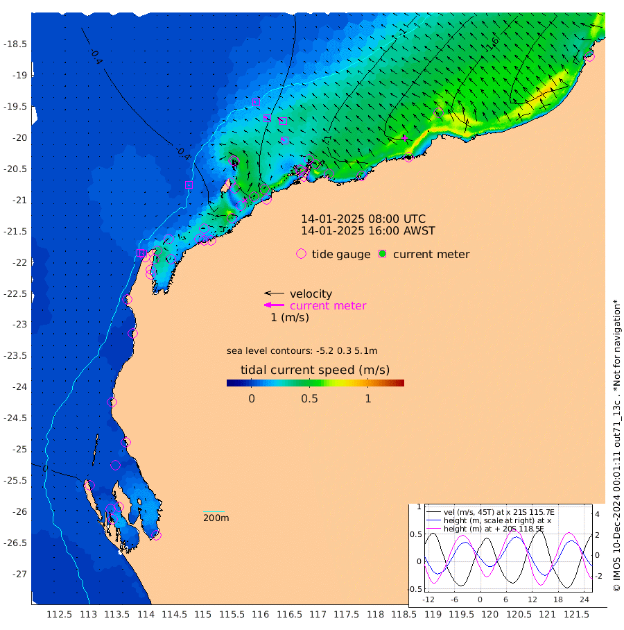 6cm/s -151T +12cm/s rms + 5cm/s -173T. NWSBAR 206m 2cm/s -131T +22cm/s rms + 10cm/s -148T. TAN100 109m 11cm/s -71T +11cm/s rms + 8cm/s -129T. PIL200 208m 17cm/s -58T +13cm/s rms + 7cm/s -137T. PIL100 105m 21cm/s -56T +12cm/s rms + 2cm/s -92T. PIL050 55m 2cm/s -120T +18cm/s rms + 4cm/s -149T. NRSNIN 61m 25cm/s -64T +6cm/s rms + 3cm/s 112T. NW Shelf M6 65m 2cm Withnell Point 5cm Denham 3cm Shark Bay (Inr Bn) 3cm Shark Bay 0cm Useless Loop -7cm Hamelin Pool -3cm Carnarvon -6cm Cape Cuvier -10cm Coral Bay -11cm Norwegian Bay -29cm Badjirrajirra -14cm Tantabiddi -20cm Point Murat -24cm Exmouth -32cm Learmonth -29cm Y Island -21cm North Muiron Island -28cm Roller -32cm Ashburton North -34cm Onslow (Beadon Creek) -33cm Thevenard Island -47cm Large Island -45cm North Sandy Island -47cm Barrow Island (Wapet Landing) -48cm Barrow Island (Tanker Mooring) -78cm Withnell Bay -37cm Trimouille Island -40cm North West Island -74cm Fortescue Road -64cm Steamboat Island -51cm Sholl Island -76cm Fairway Beacon -79cm Mawby Island -79cm Dampier (King Bay) -81cm Cape Legendre -79cm Hauy Island -96cm Port Walcott (Cape Lambert) -96cm Depuch Island -126cm Port Hedland -138cm Bedout Island -278cm Lagrange Bay