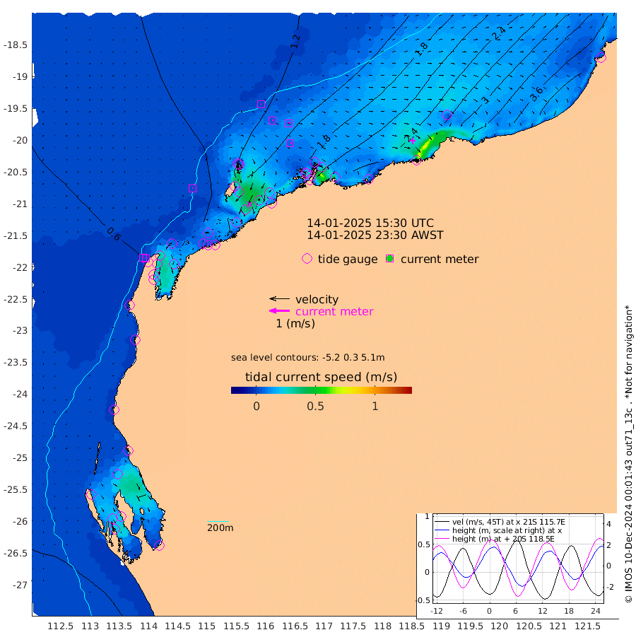 3cm/s -35T +12cm/s rms + 5cm/s -173T. NWSBAR 206m 2cm/s 32T +22cm/s rms + 10cm/s -148T. TAN100 109m 3cm/s 101T +11cm/s rms + 8cm/s -129T. PIL200 208m 4cm/s 74T +13cm/s rms + 7cm/s -137T. PIL100 105m 7cm/s 75T +12cm/s rms + 2cm/s -92T. PIL050 55m 1cm/s 33T +18cm/s rms + 4cm/s -149T. NRSNIN 61m 8cm/s 58T +6cm/s rms + 3cm/s 112T. NW Shelf M6 65m 51cm Withnell Point 49cm Denham 47cm Shark Bay (Inr Bn) 53cm Shark Bay 43cm Useless Loop -7cm Hamelin Pool 64cm Carnarvon 49cm Cape Cuvier 53cm Coral Bay 52cm Norwegian Bay 108cm Badjirrajirra 60cm Tantabiddi 84cm Point Murat 97cm Exmouth 108cm Learmonth 93cm Y Island 74cm North Muiron Island 84cm Roller 91cm Ashburton North 99cm Onslow (Beadon Creek) 95cm Thevenard Island 140cm Large Island 154cm North Sandy Island 126cm Barrow Island (Wapet Landing) 157cm Barrow Island (Tanker Mooring) 168cm Withnell Bay 114cm Trimouille Island 106cm North West Island 161cm Fortescue Road 158cm Steamboat Island 145cm Sholl Island 166cm Fairway Beacon 168cm Mawby Island 169cm Dampier (King Bay) 172cm Cape Legendre 177cm Hauy Island 205cm Port Walcott (Cape Lambert) 215cm Depuch Island 248cm Port Hedland 244cm Bedout Island 343cm Lagrange Bay