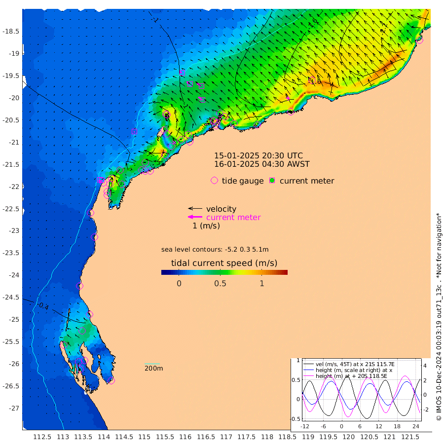 7cm/s -133T +12cm/s rms + 5cm/s -173T. NWSBAR 206m 13cm/s -139T +22cm/s rms + 10cm/s -148T. TAN100 109m 17cm/s -71T +11cm/s rms + 8cm/s -129T. PIL200 208m 29cm/s -55T +13cm/s rms + 7cm/s -137T. PIL100 105m 37cm/s -54T +12cm/s rms + 2cm/s -92T. PIL050 55m 14cm/s -135T +18cm/s rms + 4cm/s -149T. NRSNIN 61m 40cm/s -57T +6cm/s rms + 3cm/s 112T. NW Shelf M6 65m -16cm Withnell Point 12cm Denham 14cm Shark Bay (Inr Bn) 8cm Shark Bay 22cm Useless Loop 20cm Hamelin Pool -42cm Carnarvon -49cm Cape Cuvier -52cm Coral Bay -53cm Norwegian Bay -56cm Badjirrajirra -55cm Tantabiddi -53cm Point Murat -52cm Exmouth -54cm Learmonth -62cm Y Island -58cm North Muiron Island -64cm Roller -69cm Ashburton North -68cm Onslow (Beadon Creek) -71cm Thevenard Island -84cm Large Island -78cm North Sandy Island -78cm Barrow Island (Wapet Landing) -70cm Barrow Island (Tanker Mooring) -112cm Withnell Bay -75cm Trimouille Island -69cm North West Island -106cm Fortescue Road -102cm Steamboat Island -73cm Sholl Island -109cm Fairway Beacon -111cm Mawby Island -114cm Dampier (King Bay) -117cm Cape Legendre -104cm Hauy Island -126cm Port Walcott (Cape Lambert) -133cm Depuch Island -152cm Port Hedland -168cm Bedout Island -339cm Lagrange Bay