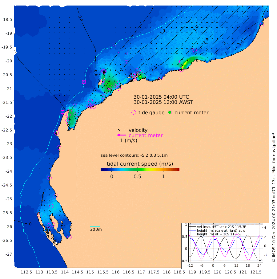5cm/s -52T +12cm/s rms + 5cm/s -173T. NWSBAR 206m 4cm/s 42T +22cm/s rms + 10cm/s -148T. TAN100 109m 3cm/s 104T +11cm/s rms + 8cm/s -129T. PIL200 208m 5cm/s 99T +13cm/s rms + 7cm/s -137T. PIL100 105m 7cm/s 91T +12cm/s rms + 2cm/s -92T. PIL050 55m 4cm/s 42T +18cm/s rms + 4cm/s -149T. NRSNIN 61m 6cm/s 66T +6cm/s rms + 3cm/s 112T. NW Shelf M6 65m 2cm Withnell Point -18cm Denham -20cm Shark Bay (Inr Bn) -21cm Shark Bay -33cm Useless Loop -20cm Hamelin Pool 23cm Carnarvon 17cm Cape Cuvier 19cm Coral Bay 23cm Norwegian Bay 65cm Badjirrajirra 27cm Tantabiddi 45cm Point Murat 56cm Exmouth 72cm Learmonth 55cm Y Island 39cm North Muiron Island 50cm Roller 56cm Ashburton North 61cm Onslow (Beadon Creek) 57cm Thevenard Island 124cm Large Island 126cm North Sandy Island 87cm Barrow Island (Wapet Landing) 116cm Barrow Island (Tanker Mooring) 132cm Withnell Bay 88cm Trimouille Island 64cm North West Island 153cm Fortescue Road 121cm Steamboat Island 121cm Sholl Island 130cm Fairway Beacon 132cm Mawby Island 133cm Dampier (King Bay) 132cm Cape Legendre 148cm Hauy Island 169cm Port Walcott (Cape Lambert) 199cm Depuch Island 215cm Port Hedland 201cm Bedout Island 350cm Lagrange Bay