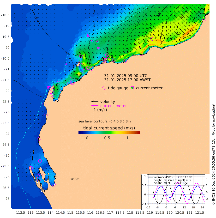 7cm/s -153T +12cm/s rms + 5cm/s -173T. NWSBAR 206m 5cm/s -137T +22cm/s rms + 10cm/s -148T. TAN100 109m 15cm/s -74T +11cm/s rms + 8cm/s -129T. PIL200 208m 23cm/s -58T +13cm/s rms + 7cm/s -137T. PIL100 105m 28cm/s -57T +12cm/s rms + 2cm/s -92T. PIL050 55m 5cm/s -129T +18cm/s rms + 4cm/s -149T. NRSNIN 61m 27cm/s -62T +6cm/s rms + 3cm/s 112T. NW Shelf M6 65m -6cm Withnell Point 7cm Denham 3cm Shark Bay (Inr Bn) 5cm Shark Bay 7cm Useless Loop 1cm Hamelin Pool -17cm Carnarvon -21cm Cape Cuvier -25cm Coral Bay -26cm Norwegian Bay -46cm Badjirrajirra -31cm Tantabiddi -36cm Point Murat -41cm Exmouth -50cm Learmonth -49cm Y Island -40cm North Muiron Island -49cm Roller -51cm Ashburton North -54cm Onslow (Beadon Creek) -54cm Thevenard Island -64cm Large Island -72cm North Sandy Island -70cm Barrow Island (Wapet Landing) -71cm Barrow Island (Tanker Mooring) -113cm Withnell Bay -67cm Trimouille Island -61cm North West Island -83cm Fortescue Road -103cm Steamboat Island -80cm Sholl Island -109cm Fairway Beacon -112cm Mawby Island -112cm Dampier (King Bay) -116cm Cape Legendre -113cm Hauy Island -134cm Port Walcott (Cape Lambert) -148cm Depuch Island -172cm Port Hedland -184cm Bedout Island -314cm Lagrange Bay