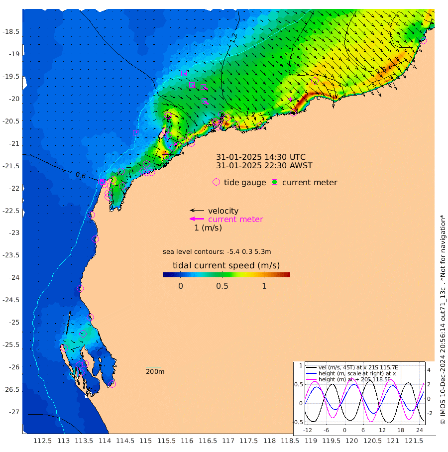 10cm/s 59T +12cm/s rms + 5cm/s -173T. NWSBAR 206m 11cm/s 41T +22cm/s rms + 10cm/s -148T. TAN100 109m 19cm/s 109T +11cm/s rms + 8cm/s -129T. PIL200 208m 30cm/s 125T +13cm/s rms + 7cm/s -137T. PIL100 105m 36cm/s 128T +12cm/s rms + 2cm/s -92T. PIL050 55m 10cm/s 45T +18cm/s rms + 4cm/s -149T. NRSNIN 61m 37cm/s 119T +6cm/s rms + 3cm/s 112T. NW Shelf M6 65m 29cm Withnell Point 13cm Denham 11cm Shark Bay (Inr Bn) 19cm Shark Bay 10cm Useless Loop -7cm Hamelin Pool 47cm Carnarvon 51cm Cape Cuvier 54cm Coral Bay 53cm Norwegian Bay 60cm Badjirrajirra 58cm Tantabiddi 57cm Point Murat 56cm Exmouth 55cm Learmonth 67cm Y Island 61cm North Muiron Island 68cm Roller 71cm Ashburton North 71cm Onslow (Beadon Creek) 74cm Thevenard Island 44cm Large Island 69cm North Sandy Island 79cm Barrow Island (Wapet Landing) 69cm Barrow Island (Tanker Mooring) 114cm Withnell Bay 64cm Trimouille Island 78cm North West Island 58cm Fortescue Road 109cm Steamboat Island 69cm Sholl Island 110cm Fairway Beacon 117cm Mawby Island 114cm Dampier (King Bay) 121cm Cape Legendre 103cm Hauy Island 124cm Port Walcott (Cape Lambert) 125cm Depuch Island 149cm Port Hedland 171cm Bedout Island 257cm Lagrange Bay