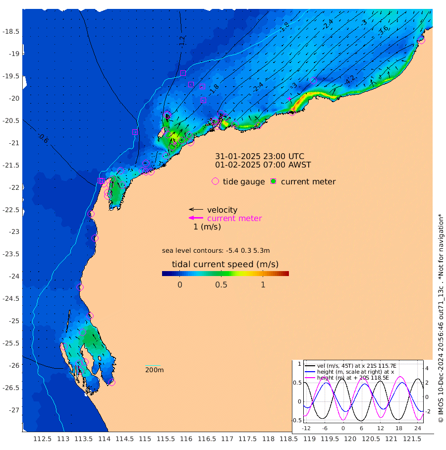4cm/s 122T +12cm/s rms + 5cm/s -173T. NWSBAR 206m 5cm/s -143T +22cm/s rms + 10cm/s -148T. TAN100 109m 2cm/s -62T +11cm/s rms + 8cm/s -129T. PIL200 208m 3cm/s -108T +13cm/s rms + 7cm/s -137T. PIL100 105m 6cm/s -111T +12cm/s rms + 2cm/s -92T. PIL050 55m 4cm/s -147T +18cm/s rms + 4cm/s -149T. NRSNIN 61m 9cm/s -158T +6cm/s rms + 3cm/s 112T. NW Shelf M6 65m -41cm Withnell Point -28cm Denham -22cm Shark Bay (Inr Bn) -29cm Shark Bay -10cm Useless Loop 22cm Hamelin Pool -69cm Carnarvon -53cm Cape Cuvier -55cm Coral Bay -58cm Norwegian Bay -124cm Badjirrajirra -66cm Tantabiddi -94cm Point Murat -110cm Exmouth -121cm Learmonth -107cm Y Island -82cm North Muiron Island -96cm Roller -103cm Ashburton North -112cm Onslow (Beadon Creek) -107cm Thevenard Island -153cm Large Island -194cm North Sandy Island -146cm Barrow Island (Wapet Landing) -187cm Barrow Island (Tanker Mooring) -201cm Withnell Bay -135cm Trimouille Island -118cm North West Island -179cm Fortescue Road -199cm Steamboat Island -189cm Sholl Island -198cm Fairway Beacon -201cm Mawby Island -201cm Dampier (King Bay) -201cm Cape Legendre -218cm Hauy Island -248cm Port Walcott (Cape Lambert) -277cm Depuch Island -302cm Port Hedland -293cm Bedout Island -358cm Lagrange Bay