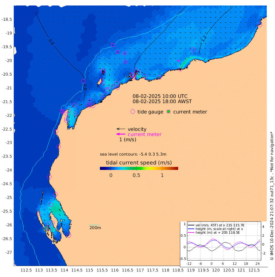 1cm/s -7T +12cm/s rms + 5cm/s -173T. NWSBAR 206m 3cm/s 41T +22cm/s rms + 10cm/s -148T. TAN100 109m 2cm/s 91T +11cm/s rms + 8cm/s -129T. PIL200 208m 5cm/s 93T +13cm/s rms + 7cm/s -137T. PIL100 105m 8cm/s 98T +12cm/s rms + 2cm/s -92T. PIL050 55m 3cm/s 39T +18cm/s rms + 4cm/s -149T. NRSNIN 61m 9cm/s 93T +6cm/s rms + 3cm/s 112T. NW Shelf M6 65m 45cm Withnell Point 42cm Denham 39cm Shark Bay (Inr Bn) 43cm Shark Bay 36cm Useless Loop -9cm Hamelin Pool 57cm Carnarvon 49cm Cape Cuvier 50cm Coral Bay 53cm Norwegian Bay 73cm Badjirrajirra 51cm Tantabiddi 61cm Point Murat 67cm Exmouth 67cm Learmonth 66cm Y Island 57cm North Muiron Island 60cm Roller 63cm Ashburton North 66cm Onslow (Beadon Creek) 65cm Thevenard Island 54cm Large Island 80cm North Sandy Island 75cm Barrow Island (Wapet Landing) 82cm Barrow Island (Tanker Mooring) 87cm Withnell Bay 65cm Trimouille Island 64cm North West Island 60cm Fortescue Road 82cm Steamboat Island 79cm Sholl Island 85cm Fairway Beacon 88cm Mawby Island 87cm Dampier (King Bay) 97cm Cape Legendre 85cm Hauy Island 97cm Port Walcott (Cape Lambert) 85cm Depuch Island 108cm Port Hedland 98cm Bedout Island 106cm Lagrange Bay