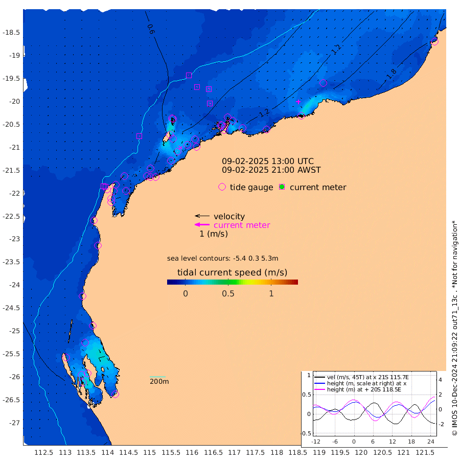 1cm/s -78T +12cm/s rms + 5cm/s -173T. NWSBAR 206m 0cm/s -11T +22cm/s rms + 10cm/s -148T. TAN100 109m 1cm/s -76T +11cm/s rms + 8cm/s -129T. PIL200 208m 3cm/s 10T +13cm/s rms + 7cm/s -137T. PIL100 105m 4cm/s 38T +12cm/s rms + 2cm/s -92T. PIL050 55m 0cm/s -51T +18cm/s rms + 4cm/s -149T. NRSNIN 61m 6cm/s 29T +6cm/s rms + 3cm/s 112T. NW Shelf M6 65m 43cm Withnell Point 49cm Denham 46cm Shark Bay (Inr Bn) 50cm Shark Bay 47cm Useless Loop -2cm Hamelin Pool 48cm Carnarvon 35cm Cape Cuvier 36cm Coral Bay 37cm Norwegian Bay 66cm Badjirrajirra 39cm Tantabiddi 53cm Point Murat 60cm Exmouth 63cm Learmonth 56cm Y Island 46cm North Muiron Island 49cm Roller 54cm Ashburton North 59cm Onslow (Beadon Creek) 56cm Thevenard Island 67cm Large Island 79cm North Sandy Island 71cm Barrow Island (Wapet Landing) 86cm Barrow Island (Tanker Mooring) 87cm Withnell Bay 60cm Trimouille Island 61cm North West Island 82cm Fortescue Road 81cm Steamboat Island 64cm Sholl Island 86cm Fairway Beacon 88cm Mawby Island 88cm Dampier (King Bay) 97cm Cape Legendre 91cm Hauy Island 103cm Port Walcott (Cape Lambert) 105cm Depuch Island 120cm Port Hedland 113cm Bedout Island 171cm Lagrange Bay