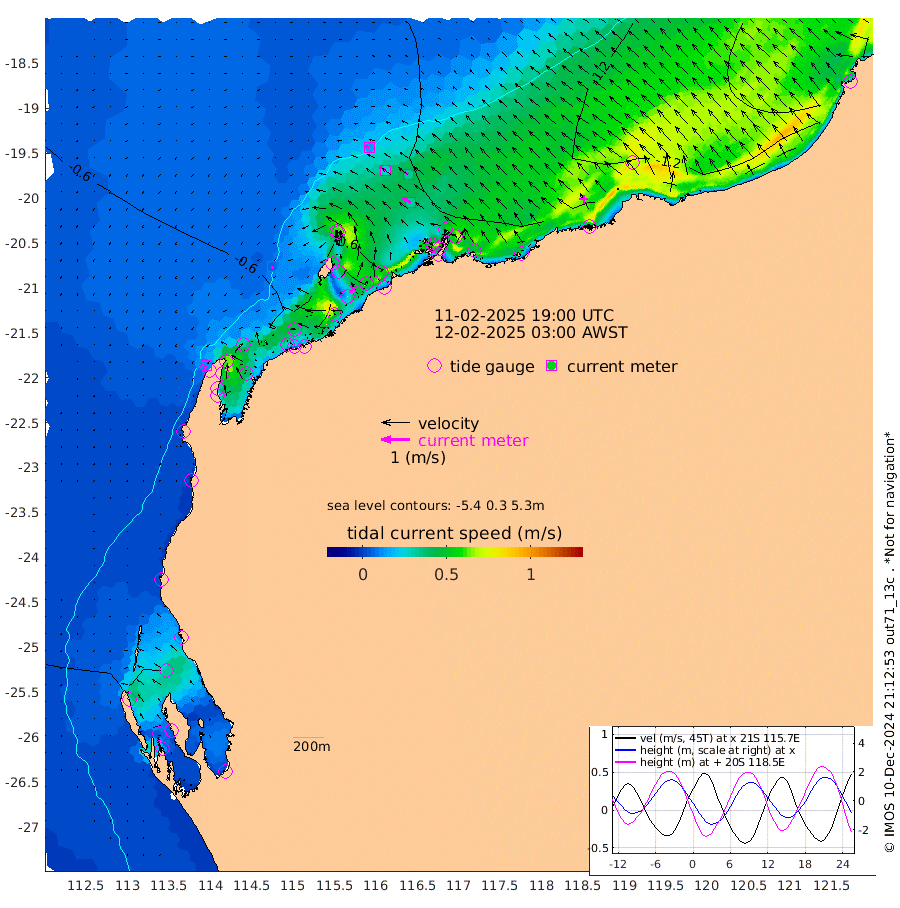 7cm/s -131T +12cm/s rms + 5cm/s -173T. NWSBAR 206m 11cm/s -137T +22cm/s rms + 10cm/s -148T. TAN100 109m 14cm/s -70T +11cm/s rms + 8cm/s -129T. PIL200 208m 26cm/s -55T +13cm/s rms + 7cm/s -137T. PIL100 105m 32cm/s -53T +12cm/s rms + 2cm/s -92T. PIL050 55m 12cm/s -135T +18cm/s rms + 4cm/s -149T. NRSNIN 61m 32cm/s -55T +6cm/s rms + 3cm/s 112T. NW Shelf M6 65m -14cm Withnell Point 11cm Denham 14cm Shark Bay (Inr Bn) 7cm Shark Bay 21cm Useless Loop 20cm Hamelin Pool -37cm Carnarvon -43cm Cape Cuvier -45cm Coral Bay -47cm Norwegian Bay -43cm Badjirrajirra -46cm Tantabiddi -42cm Point Murat -41cm Exmouth -40cm Learmonth -49cm Y Island -47cm North Muiron Island -50cm Roller -56cm Ashburton North -54cm Onslow (Beadon Creek) -57cm Thevenard Island -66cm Large Island -55cm North Sandy Island -60cm Barrow Island (Wapet Landing) -48cm Barrow Island (Tanker Mooring) -84cm Withnell Bay -56cm Trimouille Island -53cm North West Island -85cm Fortescue Road -72cm Steamboat Island -50cm Sholl Island -81cm Fairway Beacon -83cm Mawby Island -86cm Dampier (King Bay) -92cm Cape Legendre -76cm Hauy Island -91cm Port Walcott (Cape Lambert) -89cm Depuch Island -108cm Port Hedland -121cm Bedout Island -262cm Lagrange Bay