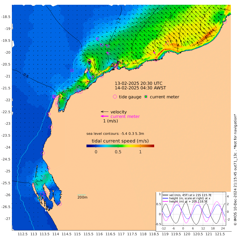 7cm/s -131T +12cm/s rms + 5cm/s -173T. NWSBAR 206m 12cm/s -139T +22cm/s rms + 10cm/s -148T. TAN100 109m 16cm/s -69T +11cm/s rms + 8cm/s -129T. PIL200 208m 28cm/s -56T +13cm/s rms + 7cm/s -137T. PIL100 105m 36cm/s -55T +12cm/s rms + 2cm/s -92T. PIL050 55m 12cm/s -136T +18cm/s rms + 4cm/s -149T. NRSNIN 61m 34cm/s -61T +6cm/s rms + 3cm/s 112T. NW Shelf M6 65m -17cm Withnell Point 4cm Denham 7cm Shark Bay (Inr Bn) 1cm Shark Bay 12cm Useless Loop 16cm Hamelin Pool -42cm Carnarvon -47cm Cape Cuvier -51cm Coral Bay -51cm Norwegian Bay -62cm Badjirrajirra -55cm Tantabiddi -56cm Point Murat -57cm Exmouth -59cm Learmonth -67cm Y Island -60cm North Muiron Island -66cm Roller -73cm Ashburton North -73cm Onslow (Beadon Creek) -74cm Thevenard Island -94cm Large Island -88cm North Sandy Island -86cm Barrow Island (Wapet Landing) -81cm Barrow Island (Tanker Mooring) -126cm Withnell Bay -78cm Trimouille Island -77cm North West Island -120cm Fortescue Road -116cm Steamboat Island -84cm Sholl Island -122cm Fairway Beacon -124cm Mawby Island -127cm Dampier (King Bay) -129cm Cape Legendre -120cm Hauy Island -144cm Port Walcott (Cape Lambert) -156cm Depuch Island -176cm Port Hedland -196cm Bedout Island -350cm Lagrange Bay