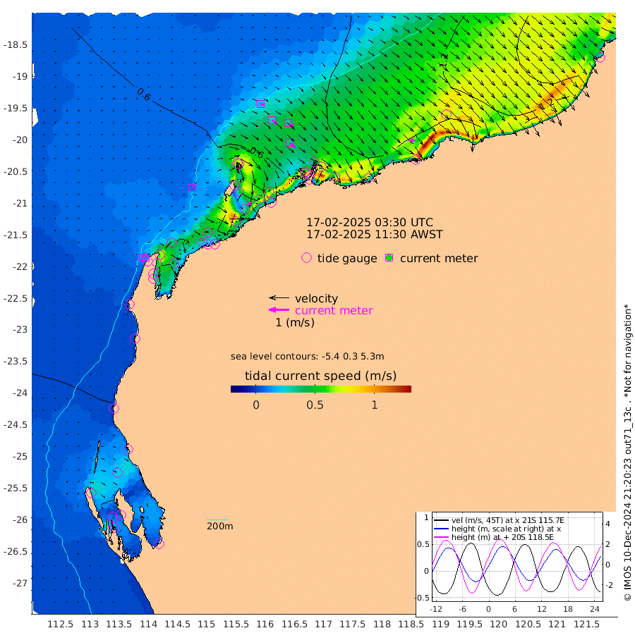 8cm/s 60T +12cm/s rms + 5cm/s -173T. NWSBAR 206m 11cm/s 40T +22cm/s rms + 10cm/s -148T. TAN100 109m 18cm/s 109T +11cm/s rms + 8cm/s -129T. PIL200 208m 31cm/s 125T +13cm/s rms + 7cm/s -137T. PIL100 105m 37cm/s 127T +12cm/s rms + 2cm/s -92T. PIL050 55m 12cm/s 47T +18cm/s rms + 4cm/s -149T. NRSNIN 61m 36cm/s 122T +6cm/s rms + 3cm/s 112T. NW Shelf M6 65m 7cm Withnell Point -14cm Denham -10cm Shark Bay (Inr Bn) -13cm Shark Bay -18cm Useless Loop -9cm Hamelin Pool 23cm Carnarvon 33cm Cape Cuvier 36cm Coral Bay 36cm Norwegian Bay 31cm Badjirrajirra 39cm Tantabiddi 32cm Point Murat 31cm Exmouth 37cm Learmonth 43cm Y Island 41cm North Muiron Island 48cm Roller 49cm Ashburton North 47cm Onslow (Beadon Creek) 49cm Thevenard Island 53cm Large Island 49cm North Sandy Island 53cm Barrow Island (Wapet Landing) 38cm Barrow Island (Tanker Mooring) 86cm Withnell Bay 52cm Trimouille Island 50cm North West Island 63cm Fortescue Road 71cm Steamboat Island 46cm Sholl Island 82cm Fairway Beacon 87cm Mawby Island 85cm Dampier (King Bay) 87cm Cape Legendre 73cm Hauy Island 93cm Port Walcott (Cape Lambert) 107cm Depuch Island 118cm Port Hedland 131cm Bedout Island 266cm Lagrange Bay
