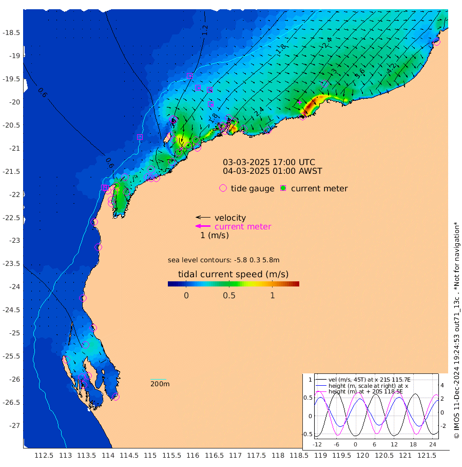 6cm/s 4T +12cm/s rms + 5cm/s -173T. NWSBAR 206m 5cm/s 45T +22cm/s rms + 10cm/s -148T. TAN100 109m 9cm/s 100T +11cm/s rms + 8cm/s -129T. PIL200 208m 12cm/s 114T +13cm/s rms + 7cm/s -137T. PIL100 105m 14cm/s 113T +12cm/s rms + 2cm/s -92T. PIL050 55m 4cm/s 46T +18cm/s rms + 4cm/s -149T. NRSNIN 61m 11cm/s 99T +6cm/s rms + 3cm/s 112T. NW Shelf M6 65m 14cm Withnell Point -6cm Denham -8cm Shark Bay (Inr Bn) -3cm Shark Bay -18cm Useless Loop -16cm Hamelin Pool 40cm Carnarvon 34cm Cape Cuvier 38cm Coral Bay 40cm Norwegian Bay 101cm Badjirrajirra 49cm Tantabiddi 74cm Point Murat 88cm Exmouth 104cm Learmonth 88cm Y Island 65cm North Muiron Island 81cm Roller 88cm Ashburton North 95cm Onslow (Beadon Creek) 91cm Thevenard Island 103cm Large Island 168cm North Sandy Island 130cm Barrow Island (Wapet Landing) 161cm Barrow Island (Tanker Mooring) 192cm Withnell Bay 122cm Trimouille Island 104cm North West Island 127cm Fortescue Road 186cm Steamboat Island 187cm Sholl Island 188cm Fairway Beacon 194cm Mawby Island 193cm Dampier (King Bay) 192cm Cape Legendre 207cm Hauy Island 240cm Port Walcott (Cape Lambert) 258cm Depuch Island 301cm Port Hedland 299cm Bedout Island 325cm Lagrange Bay