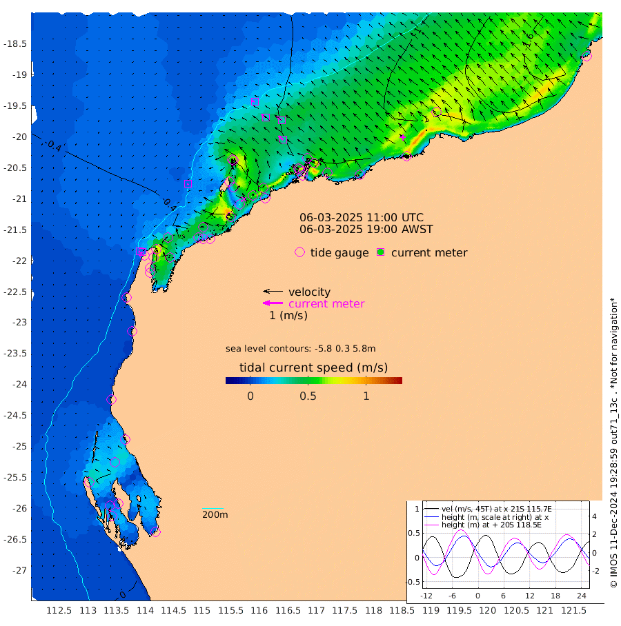8cm/s -135T +12cm/s rms + 5cm/s -173T. NWSBAR 206m 10cm/s -137T +22cm/s rms + 10cm/s -148T. TAN100 109m 17cm/s -74T +11cm/s rms + 8cm/s -129T. PIL200 208m 27cm/s -54T +13cm/s rms + 7cm/s -137T. PIL100 105m 32cm/s -51T +12cm/s rms + 2cm/s -92T. PIL050 55m 10cm/s -131T +18cm/s rms + 4cm/s -149T. NRSNIN 61m 31cm/s -52T +6cm/s rms + 3cm/s 112T. NW Shelf M6 65m 7cm Withnell Point 36cm Denham 34cm Shark Bay (Inr Bn) 32cm Shark Bay 45cm Useless Loop 15cm Hamelin Pool -12cm Carnarvon -25cm Cape Cuvier -28cm Coral Bay -27cm Norwegian Bay -30cm Badjirrajirra -31cm Tantabiddi -28cm Point Murat -27cm Exmouth -36cm Learmonth -35cm Y Island -33cm North Muiron Island -41cm Roller -43cm Ashburton North -41cm Onslow (Beadon Creek) -44cm Thevenard Island -30cm Large Island -55cm North Sandy Island -51cm Barrow Island (Wapet Landing) -43cm Barrow Island (Tanker Mooring) -85cm Withnell Bay -53cm Trimouille Island -48cm North West Island -32cm Fortescue Road -77cm Steamboat Island -73cm Sholl Island -82cm Fairway Beacon -87cm Mawby Island -85cm Dampier (King Bay) -82cm Cape Legendre -78cm Hauy Island -98cm Port Walcott (Cape Lambert) -101cm Depuch Island -125cm Port Hedland -135cm Bedout Island -166cm Lagrange Bay