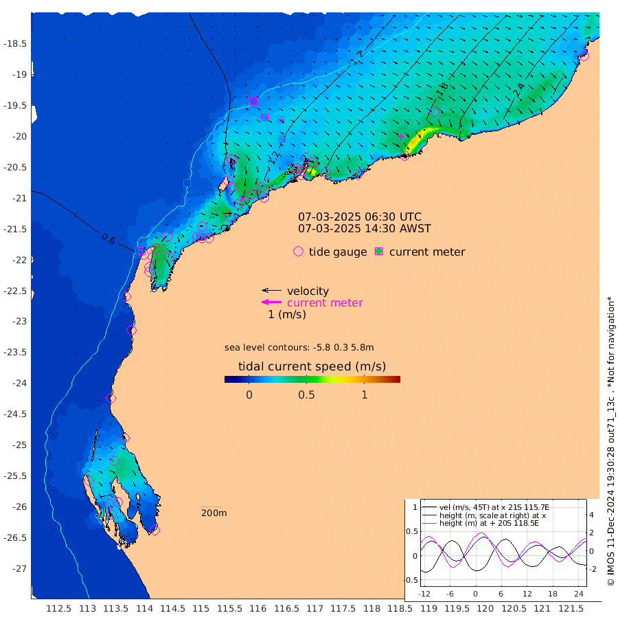 2cm/s 34T +12cm/s rms + 5cm/s -173T. NWSBAR 206m 6cm/s 39T +22cm/s rms + 10cm/s -148T. TAN100 109m 7cm/s 100T +11cm/s rms + 8cm/s -129T. PIL200 208m 12cm/s 112T +13cm/s rms + 7cm/s -137T. PIL100 105m 14cm/s 114T +12cm/s rms + 2cm/s -92T. PIL050 55m 6cm/s 43T +18cm/s rms + 4cm/s -149T. NRSNIN 61m 17cm/s 106T +6cm/s rms + 3cm/s 112T. NW Shelf M6 65m 41cm Withnell Point 30cm Denham 29cm Shark Bay (Inr Bn) 31cm Shark Bay 21cm Useless Loop -14cm Hamelin Pool 60cm Carnarvon 56cm Cape Cuvier 59cm Coral Bay 59cm Norwegian Bay 91cm Badjirrajirra 63cm Tantabiddi 75cm Point Murat 83cm Exmouth 91cm Learmonth 85cm Y Island 72cm North Muiron Island 81cm Roller 84cm Ashburton North 88cm Onslow (Beadon Creek) 86cm Thevenard Island 94cm Large Island 124cm North Sandy Island 105cm Barrow Island (Wapet Landing) 118cm Barrow Island (Tanker Mooring) 137cm Withnell Bay 99cm Trimouille Island 93cm North West Island 96cm Fortescue Road 136cm Steamboat Island 130cm Sholl Island 134cm Fairway Beacon 139cm Mawby Island 138cm Dampier (King Bay) 139cm Cape Legendre 137cm Hauy Island 161cm Port Walcott (Cape Lambert) 163cm Depuch Island 192cm Port Hedland 184cm Bedout Island 201cm Lagrange Bay