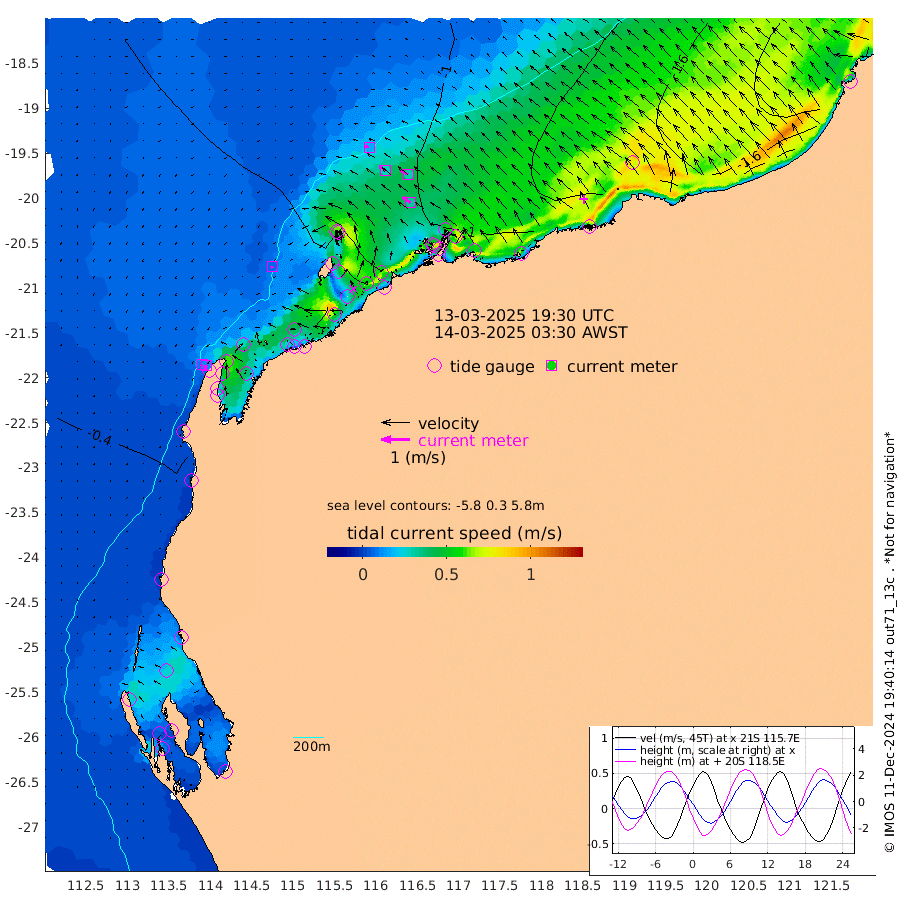 8cm/s -129T +12cm/s rms + 5cm/s -173T. NWSBAR 206m 10cm/s -138T +22cm/s rms + 10cm/s -148T. TAN100 109m 15cm/s -69T +11cm/s rms + 8cm/s -129T. PIL200 208m 27cm/s -55T +13cm/s rms + 7cm/s -137T. PIL100 105m 34cm/s -53T +12cm/s rms + 2cm/s -92T. PIL050 55m 11cm/s -135T +18cm/s rms + 4cm/s -149T. NRSNIN 61m 30cm/s -60T +6cm/s rms + 3cm/s 112T. NW Shelf M6 65m -12cm Withnell Point 5cm Denham 7cm Shark Bay (Inr Bn) 1cm Shark Bay 10cm Useless Loop 12cm Hamelin Pool -33cm Carnarvon -38cm Cape Cuvier -41cm Coral Bay -42cm Norwegian Bay -47cm Badjirrajirra -44cm Tantabiddi -43cm Point Murat -44cm Exmouth -44cm Learmonth -53cm Y Island -48cm North Muiron Island -52cm Roller -59cm Ashburton North -58cm Onslow (Beadon Creek) -60cm Thevenard Island -70cm Large Island -65cm North Sandy Island -68cm Barrow Island (Wapet Landing) -59cm Barrow Island (Tanker Mooring) -103cm Withnell Bay -58cm Trimouille Island -63cm North West Island -95cm Fortescue Road -92cm Steamboat Island -62cm Sholl Island -99cm Fairway Beacon -101cm Mawby Island -103cm Dampier (King Bay) -106cm Cape Legendre -96cm Hauy Island -116cm Port Walcott (Cape Lambert) -124cm Depuch Island -142cm Port Hedland -164cm Bedout Island -287cm Lagrange Bay