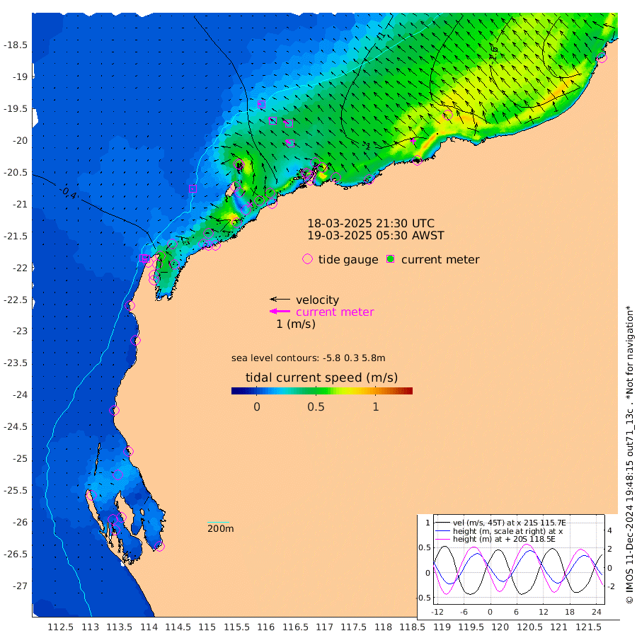 7cm/s -126T +12cm/s rms + 5cm/s -173T. NWSBAR 206m 8cm/s -141T +22cm/s rms + 10cm/s -148T. TAN100 109m 15cm/s -72T +11cm/s rms + 8cm/s -129T. PIL200 208m 25cm/s -56T +13cm/s rms + 7cm/s -137T. PIL100 105m 30cm/s -54T +12cm/s rms + 2cm/s -92T. PIL050 55m 8cm/s -134T +18cm/s rms + 4cm/s -149T. NRSNIN 61m 30cm/s -63T +6cm/s rms + 3cm/s 112T. NW Shelf M6 65m -10cm Withnell Point -4cm Denham -6cm Shark Bay (Inr Bn) -6cm Shark Bay -6cm Useless Loop -3cm Hamelin Pool -21cm Carnarvon -27cm Cape Cuvier -30cm Coral Bay -29cm Norwegian Bay -40cm Badjirrajirra -35cm Tantabiddi -35cm Point Murat -37cm Exmouth -40cm Learmonth -48cm Y Island -41cm North Muiron Island -49cm Roller -51cm Ashburton North -51cm Onslow (Beadon Creek) -52cm Thevenard Island -30cm Large Island -62cm North Sandy Island -61cm Barrow Island (Wapet Landing) -55cm Barrow Island (Tanker Mooring) -99cm Withnell Bay -51cm Trimouille Island -57cm North West Island -46cm Fortescue Road -91cm Steamboat Island -64cm Sholl Island -95cm Fairway Beacon -101cm Mawby Island -98cm Dampier (King Bay) -97cm Cape Legendre -90cm Hauy Island -114cm Port Walcott (Cape Lambert) -128cm Depuch Island -145cm Port Hedland -170cm Bedout Island -221cm Lagrange Bay