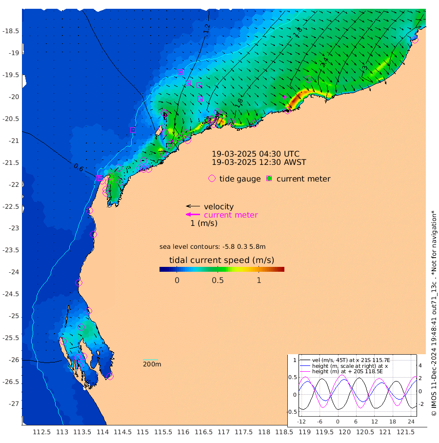 3cm/s 24T +12cm/s rms + 5cm/s -173T. NWSBAR 206m 8cm/s 39T +22cm/s rms + 10cm/s -148T. TAN100 109m 11cm/s 106T +11cm/s rms + 8cm/s -129T. PIL200 208m 18cm/s 118T +13cm/s rms + 7cm/s -137T. PIL100 105m 21cm/s 119T +12cm/s rms + 2cm/s -92T. PIL050 55m 8cm/s 44T +18cm/s rms + 4cm/s -149T. NRSNIN 61m 25cm/s 114T +6cm/s rms + 3cm/s 112T. NW Shelf M6 65m 35cm Withnell Point 20cm Denham 21cm Shark Bay (Inr Bn) 22cm Shark Bay 10cm Useless Loop -14cm Hamelin Pool 56cm Carnarvon 52cm Cape Cuvier 56cm Coral Bay 57cm Norwegian Bay 92cm Badjirrajirra 63cm Tantabiddi 76cm Point Murat 85cm Exmouth 94cm Learmonth 91cm Y Island 76cm North Muiron Island 89cm Roller 90cm Ashburton North 94cm Onslow (Beadon Creek) 93cm Thevenard Island 114cm Large Island 143cm North Sandy Island 117cm Barrow Island (Wapet Landing) 132cm Barrow Island (Tanker Mooring) 166cm Withnell Bay 116cm Trimouille Island 100cm North West Island 126cm Fortescue Road 158cm Steamboat Island 141cm Sholl Island 161cm Fairway Beacon 164cm Mawby Island 165cm Dampier (King Bay) 164cm Cape Legendre 167cm Hauy Island 196cm Port Walcott (Cape Lambert) 221cm Depuch Island 241cm Port Hedland 246cm Bedout Island 335cm Lagrange Bay