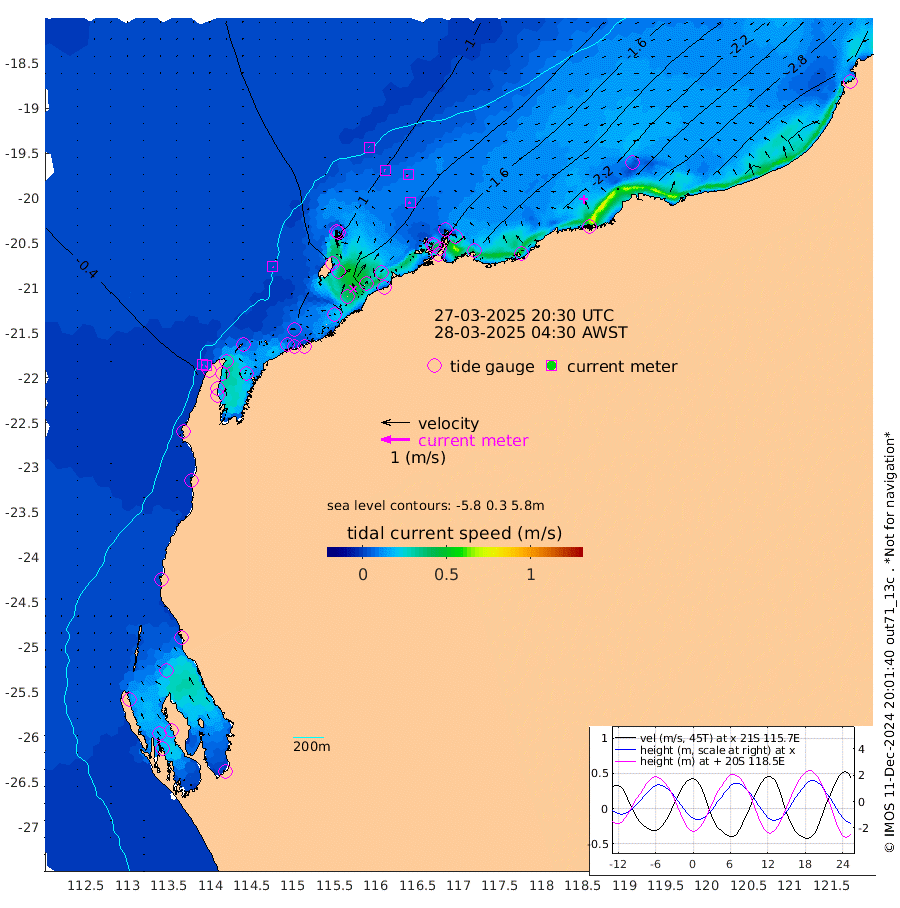 3cm/s 133T +12cm/s rms + 5cm/s -173T. NWSBAR 206m 4cm/s -139T +22cm/s rms + 10cm/s -148T. TAN100 109m 2cm/s -54T +11cm/s rms + 8cm/s -129T. PIL200 208m 4cm/s -74T +13cm/s rms + 7cm/s -137T. PIL100 105m 7cm/s -82T +12cm/s rms + 2cm/s -92T. PIL050 55m 4cm/s -148T +18cm/s rms + 4cm/s -149T. NRSNIN 61m 7cm/s -123T +6cm/s rms + 3cm/s 112T. NW Shelf M6 65m -27cm Withnell Point -19cm Denham -15cm Shark Bay (Inr Bn) -21cm Shark Bay -7cm Useless Loop 16cm Hamelin Pool -46cm Carnarvon -35cm Cape Cuvier -37cm Coral Bay -38cm Norwegian Bay -84cm Badjirrajirra -45cm Tantabiddi -64cm Point Murat -75cm Exmouth -83cm Learmonth -74cm Y Island -56cm North Muiron Island -68cm Roller -73cm Ashburton North -78cm Onslow (Beadon Creek) -76cm Thevenard Island -104cm Large Island -137cm North Sandy Island -104cm Barrow Island (Wapet Landing) -130cm Barrow Island (Tanker Mooring) -147cm Withnell Bay -90cm Trimouille Island -87cm North West Island -128cm Fortescue Road -142cm Steamboat Island -127cm Sholl Island -144cm Fairway Beacon -147cm Mawby Island -147cm Dampier (King Bay) -147cm Cape Legendre -160cm Hauy Island -181cm Port Walcott (Cape Lambert) -209cm Depuch Island -223cm Port Hedland -220cm Bedout Island -284cm Lagrange Bay