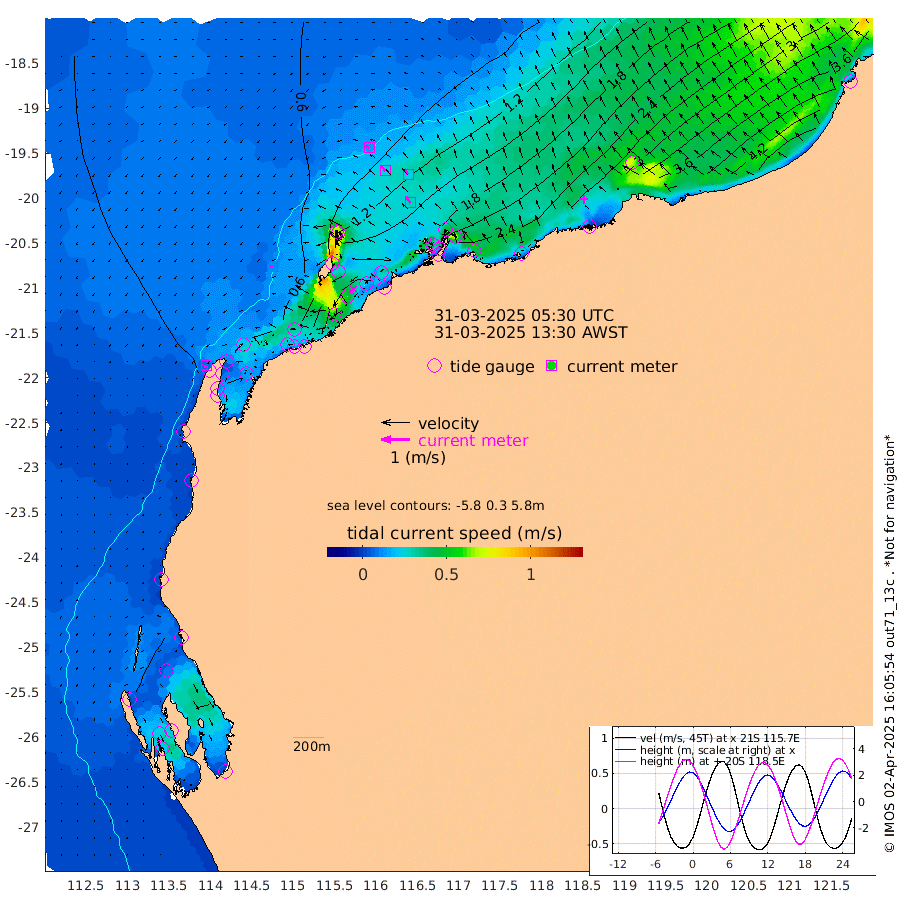 13cm/s -94T +12cm/s rms + 5cm/s -173T. NWSBAR 206m 7cm/s -136T +22cm/s rms + 10cm/s -148T. TAN100 109m 14cm/s -71T +11cm/s rms + 8cm/s -129T. PIL200 208m 25cm/s -44T +13cm/s rms + 7cm/s -137T. PIL100 105m 29cm/s -37T +12cm/s rms + 2cm/s -92T. PIL050 55m 7cm/s -128T +18cm/s rms + 4cm/s -149T. NRSNIN 61m 23cm/s -34T +6cm/s rms + 3cm/s 112T. NW Shelf M6 65m 36cm Withnell Point 44cm Denham 40cm Shark Bay (Inr Bn) 41cm Shark Bay 34cm Useless Loop -8cm Hamelin Pool 46cm Carnarvon 21cm Cape Cuvier 23cm Coral Bay 28cm Norwegian Bay 107cm Badjirrajirra 34cm Tantabiddi 72cm Point Murat 94cm Exmouth 106cm Learmonth 81cm Y Island 54cm North Muiron Island 66cm Roller 71cm Ashburton North 83cm Onslow (Beadon Creek) 74cm Thevenard Island 146cm Large Island 180cm North Sandy Island 119cm Barrow Island (Wapet Landing) 179cm Barrow Island (Tanker Mooring) 159cm Withnell Bay 119cm Trimouille Island 87cm North West Island 166cm Fortescue Road 164cm Steamboat Island 174cm Sholl Island 158cm Fairway Beacon 155cm Mawby Island 159cm Dampier (King Bay) 156cm Cape Legendre 189cm Hauy Island 209cm Port Walcott (Cape Lambert) 242cm Depuch Island 258cm Port Hedland 234cm Bedout Island 263cm Lagrange Bay