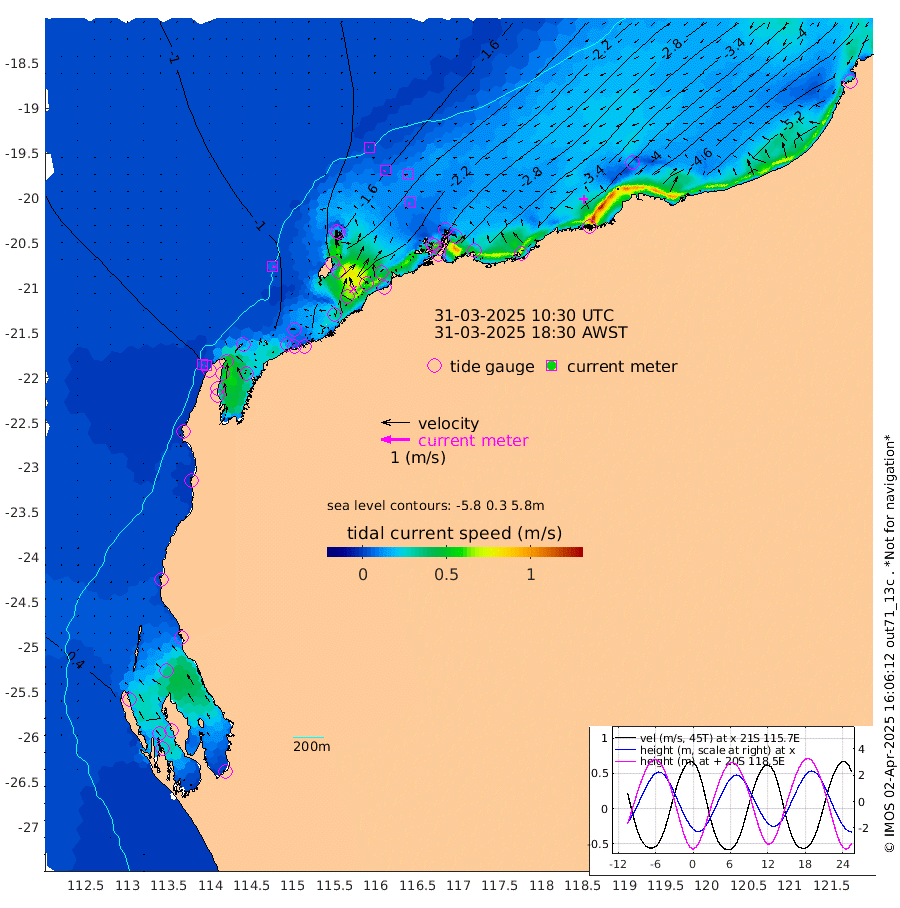 7cm/s 118T +12cm/s rms + 5cm/s -173T. NWSBAR 206m 4cm/s -140T +22cm/s rms + 10cm/s -148T. TAN100 109m 2cm/s -95T +11cm/s rms + 8cm/s -129T. PIL200 208m 5cm/s -107T +13cm/s rms + 7cm/s -137T. PIL100 105m 8cm/s -116T +12cm/s rms + 2cm/s -92T. PIL050 55m 3cm/s -143T +18cm/s rms + 4cm/s -149T. NRSNIN 61m 11cm/s -105T +6cm/s rms + 3cm/s 112T. NW Shelf M6 65m -47cm Withnell Point -25cm Denham -22cm Shark Bay (Inr Bn) -25cm Shark Bay -4cm Useless Loop 27cm Hamelin Pool -74cm Carnarvon -58cm Cape Cuvier -61cm Coral Bay -66cm Norwegian Bay -140cm Badjirrajirra -73cm Tantabiddi -106cm Point Murat -124cm Exmouth -145cm Learmonth -119cm Y Island -93cm North Muiron Island -111cm Roller -116cm Ashburton North -127cm Onslow (Beadon Creek) -121cm Thevenard Island -155cm Large Island -219cm North Sandy Island -167cm Barrow Island (Wapet Landing) -213cm Barrow Island (Tanker Mooring) -230cm Withnell Bay -165cm Trimouille Island -137cm North West Island -173cm Fortescue Road -229cm Steamboat Island -220cm Sholl Island -227cm Fairway Beacon -230cm Mawby Island -230cm Dampier (King Bay) -234cm Cape Legendre -251cm Hauy Island -284cm Port Walcott (Cape Lambert) -318cm Depuch Island -348cm Port Hedland -318cm Bedout Island -384cm Lagrange Bay