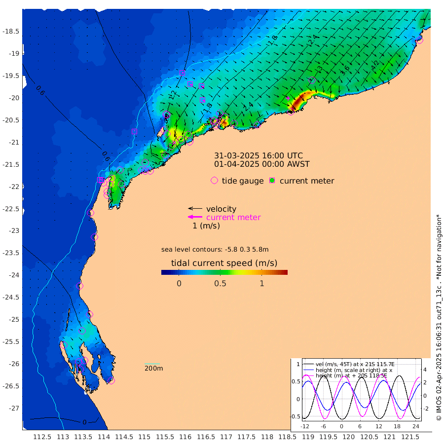 6cm/s 2T +12cm/s rms + 5cm/s -173T. NWSBAR 206m 6cm/s 45T +22cm/s rms + 10cm/s -148T. TAN100 109m 10cm/s 101T +11cm/s rms + 8cm/s -129T. PIL200 208m 15cm/s 115T +13cm/s rms + 7cm/s -137T. PIL100 105m 17cm/s 116T +12cm/s rms + 2cm/s -92T. PIL050 55m 6cm/s 45T +18cm/s rms + 4cm/s -149T. NRSNIN 61m 16cm/s 110T +6cm/s rms + 3cm/s 112T. NW Shelf M6 65m 9cm Withnell Point -15cm Denham -16cm Shark Bay (Inr Bn) -12cm Shark Bay -28cm Useless Loop -18cm Hamelin Pool 37cm Carnarvon 33cm Cape Cuvier 37cm Coral Bay 40cm Norwegian Bay 98cm Badjirrajirra 49cm Tantabiddi 71cm Point Murat 85cm Exmouth 103cm Learmonth 85cm Y Island 63cm North Muiron Island 80cm Roller 87cm Ashburton North 94cm Onslow (Beadon Creek) 91cm Thevenard Island 99cm Large Island 168cm North Sandy Island 129cm Barrow Island (Wapet Landing) 159cm Barrow Island (Tanker Mooring) 195cm Withnell Bay 124cm Trimouille Island 103cm North West Island 126cm Fortescue Road 186cm Steamboat Island 185cm Sholl Island 190cm Fairway Beacon 196cm Mawby Island 195cm Dampier (King Bay) 196cm Cape Legendre 210cm Hauy Island 243cm Port Walcott (Cape Lambert) 264cm Depuch Island 306cm Port Hedland 303cm Bedout Island 352cm Lagrange Bay