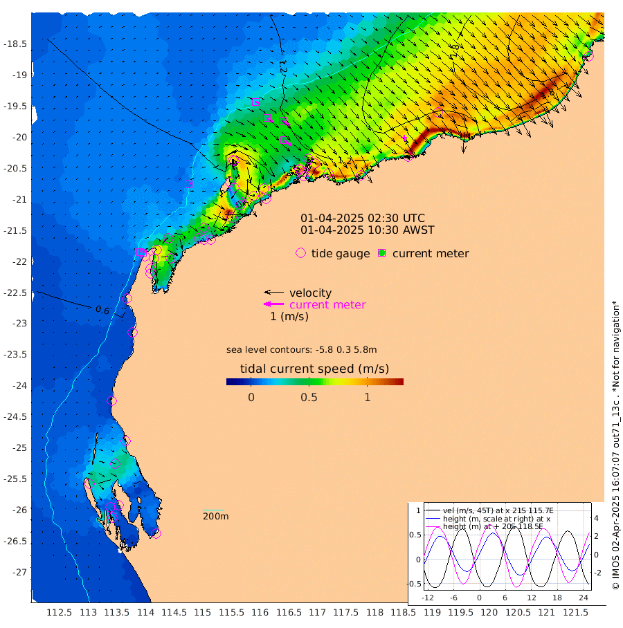 10cm/s 60T +12cm/s rms + 5cm/s -173T. NWSBAR 206m 14cm/s 41T +22cm/s rms + 10cm/s -148T. TAN100 109m 22cm/s 109T +11cm/s rms + 8cm/s -129T. PIL200 208m 38cm/s 124T +13cm/s rms + 7cm/s -137T. PIL100 105m 46cm/s 126T +12cm/s rms + 2cm/s -92T. PIL050 55m 14cm/s 47T +18cm/s rms + 4cm/s -149T. NRSNIN 61m 46cm/s 122T +6cm/s rms + 3cm/s 112T. NW Shelf M6 65m 30cm Withnell Point 9cm Denham 10cm Shark Bay (Inr Bn) 12cm Shark Bay 3cm Useless Loop -11cm Hamelin Pool 50cm Carnarvon 58cm Cape Cuvier 63cm Coral Bay 61cm Norwegian Bay 65cm Badjirrajirra 66cm Tantabiddi 62cm Point Murat 62cm Exmouth 67cm Learmonth 73cm Y Island 70cm North Muiron Island 78cm Roller 82cm Ashburton North 81cm Onslow (Beadon Creek) 84cm Thevenard Island 47cm Large Island 80cm North Sandy Island 91cm Barrow Island (Wapet Landing) 73cm Barrow Island (Tanker Mooring) 134cm Withnell Bay 85cm Trimouille Island 88cm North West Island 55cm Fortescue Road 125cm Steamboat Island 83cm Sholl Island 128cm Fairway Beacon 133cm Mawby Island 133cm Dampier (King Bay) 141cm Cape Legendre 117cm Hauy Island 145cm Port Walcott (Cape Lambert) 152cm Depuch Island 177cm Port Hedland 195cm Bedout Island 252cm Lagrange Bay