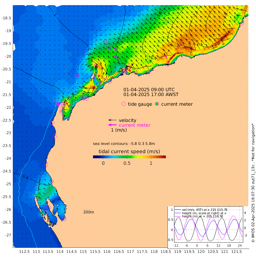 10cm/s -138T +12cm/s rms + 5cm/s -173T. NWSBAR 206m 14cm/s -138T +22cm/s rms + 10cm/s -148T. TAN100 109m 23cm/s -74T +11cm/s rms + 8cm/s -129T. PIL200 208m 38cm/s -56T +13cm/s rms + 7cm/s -137T. PIL100 105m 45cm/s -54T +12cm/s rms + 2cm/s -92T. PIL050 55m 14cm/s -132T +18cm/s rms + 4cm/s -149T. NRSNIN 61m 44cm/s -56T +6cm/s rms + 3cm/s 112T. NW Shelf M6 65m -15cm Withnell Point 21cm Denham 20cm Shark Bay (Inr Bn) 16cm Shark Bay 34cm Useless Loop 21cm Hamelin Pool -42cm Carnarvon -53cm Cape Cuvier -57cm Coral Bay -56cm Norwegian Bay -68cm Badjirrajirra -62cm Tantabiddi -61cm Point Murat -63cm Exmouth -74cm Learmonth -73cm Y Island -67cm North Muiron Island -78cm Roller -83cm Ashburton North -82cm Onslow (Beadon Creek) -85cm Thevenard Island -49cm Large Island -101cm North Sandy Island -99cm Barrow Island (Wapet Landing) -89cm Barrow Island (Tanker Mooring) -150cm Withnell Bay -95cm Trimouille Island -91cm North West Island -59cm Fortescue Road -138cm Steamboat Island -112cm Sholl Island -145cm Fairway Beacon -152cm Mawby Island -150cm Dampier (King Bay) -156cm Cape Legendre -140cm Hauy Island -171cm Port Walcott (Cape Lambert) -178cm Depuch Island -211cm Port Hedland -220cm Bedout Island -278cm Lagrange Bay