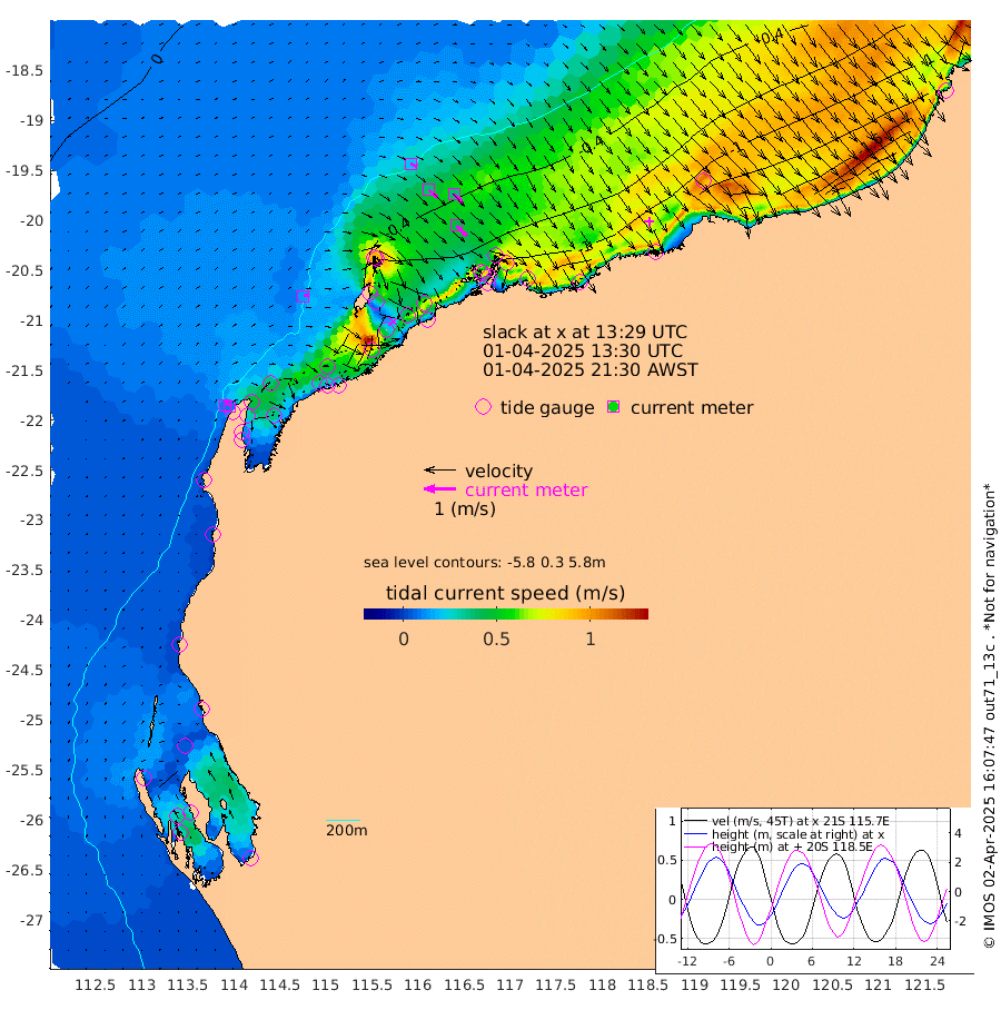 14cm/s 71T +12cm/s rms + 5cm/s -173T. NWSBAR 206m 10cm/s 43T +22cm/s rms + 10cm/s -148T. TAN100 109m 22cm/s 111T +11cm/s rms + 8cm/s -129T. PIL200 208m 37cm/s 131T +13cm/s rms + 7cm/s -137T. PIL100 105m 45cm/s 134T +12cm/s rms + 2cm/s -92T. PIL050 55m 10cm/s 51T +18cm/s rms + 4cm/s -149T. NRSNIN 61m 38cm/s 135T +6cm/s rms + 3cm/s 112T. NW Shelf M6 65m -42cm Withnell Point -50cm Denham -45cm Shark Bay (Inr Bn) -46cm Shark Bay -36cm Useless Loop 14cm Hamelin Pool -43cm Carnarvon -17cm Cape Cuvier -15cm Coral Bay -19cm Norwegian Bay -69cm Badjirrajirra -18cm Tantabiddi -46cm Point Murat -61cm Exmouth -69cm Learmonth -44cm Y Island -28cm North Muiron Island -33cm Roller -32cm Ashburton North -42cm Onslow (Beadon Creek) -34cm Thevenard Island -102cm Large Island -103cm North Sandy Island -59cm Barrow Island (Wapet Landing) -108cm Barrow Island (Tanker Mooring) -56cm Withnell Bay -61cm Trimouille Island -41cm North West Island -98cm Fortescue Road -69cm Steamboat Island -88cm Sholl Island -60cm Fairway Beacon -57cm Mawby Island -57cm Dampier (King Bay) -58cm Cape Legendre -83cm Hauy Island -80cm Port Walcott (Cape Lambert) -96cm Depuch Island -89cm Port Hedland -39cm Bedout Island -41cm Lagrange Bay