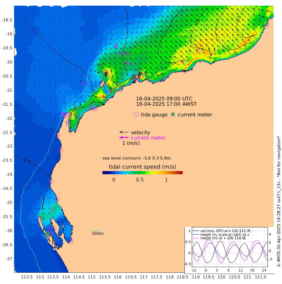 7cm/s -147T +12cm/s rms + 5cm/s -173T. NWSBAR 206m 12cm/s -138T +22cm/s rms + 10cm/s -148T. TAN100 109m 17cm/s -75T +11cm/s rms + 8cm/s -129T. PIL200 208m 30cm/s -55T +13cm/s rms + 7cm/s -137T. PIL100 105m 35cm/s -54T +12cm/s rms + 2cm/s -92T. PIL050 55m 12cm/s -133T +18cm/s rms + 4cm/s -149T. NRSNIN 61m 39cm/s -56T +6cm/s rms + 3cm/s 112T. NW Shelf M6 65m -13cm Withnell Point 18cm Denham 18cm Shark Bay (Inr Bn) 14cm Shark Bay 30cm Useless Loop 20cm Hamelin Pool -35cm Carnarvon -42cm Cape Cuvier -45cm Coral Bay -46cm Norwegian Bay -55cm Badjirrajirra -51cm Tantabiddi -50cm Point Murat -52cm Exmouth -57cm Learmonth -62cm Y Island -57cm North Muiron Island -68cm Roller -67cm Ashburton North -67cm Onslow (Beadon Creek) -69cm Thevenard Island -42cm Large Island -87cm North Sandy Island -80cm Barrow Island (Wapet Landing) -76cm Barrow Island (Tanker Mooring) -125cm Withnell Bay -81cm Trimouille Island -75cm North West Island -51cm Fortescue Road -123cm Steamboat Island -91cm Sholl Island -120cm Fairway Beacon -124cm Mawby Island -123cm Dampier (King Bay) -125cm Cape Legendre -120cm Hauy Island -141cm Port Walcott (Cape Lambert) -166cm Depuch Island -175cm Port Hedland -183cm Bedout Island -263cm Lagrange Bay