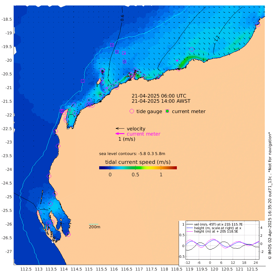 1cm/s 50T +12cm/s rms + 5cm/s -173T. NWSBAR 206m 3cm/s 37T +22cm/s rms + 10cm/s -148T. TAN100 109m 5cm/s 106T +11cm/s rms + 8cm/s -129T. PIL200 208m 6cm/s 116T +13cm/s rms + 7cm/s -137T. PIL100 105m 7cm/s 122T +12cm/s rms + 2cm/s -92T. PIL050 55m 2cm/s 39T +18cm/s rms + 4cm/s -149T. NRSNIN 61m 16cm/s 110T +6cm/s rms + 3cm/s 112T. NW Shelf M6 65m 28cm Withnell Point 24cm Denham 22cm Shark Bay (Inr Bn) 27cm Shark Bay 20cm Useless Loop -6cm Hamelin Pool 38cm Carnarvon 36cm Cape Cuvier 38cm Coral Bay 37cm Norwegian Bay 54cm Badjirrajirra 40cm Tantabiddi 47cm Point Murat 50cm Exmouth 48cm Learmonth 52cm Y Island 45cm North Muiron Island 50cm Roller 49cm Ashburton North 52cm Onslow (Beadon Creek) 51cm Thevenard Island 47cm Large Island 67cm North Sandy Island 60cm Barrow Island (Wapet Landing) 66cm Barrow Island (Tanker Mooring) 75cm Withnell Bay 52cm Trimouille Island 57cm North West Island 43cm Fortescue Road 88cm Steamboat Island 71cm Sholl Island 74cm Fairway Beacon 78cm Mawby Island 76cm Dampier (King Bay) 76cm Cape Legendre 77cm Hauy Island 86cm Port Walcott (Cape Lambert) 86cm Depuch Island 100cm Port Hedland 104cm Bedout Island 105cm Lagrange Bay