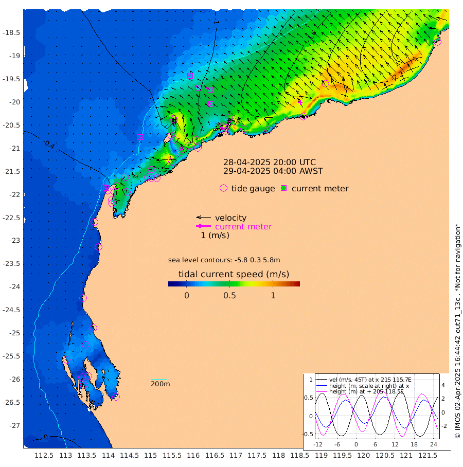 8cm/s -140T +12cm/s rms + 5cm/s -173T. NWSBAR 206m 7cm/s -136T +22cm/s rms + 10cm/s -148T. TAN100 109m 16cm/s -71T +11cm/s rms + 8cm/s -129T. PIL200 208m 27cm/s -57T +13cm/s rms + 7cm/s -137T. PIL100 105m 33cm/s -55T +12cm/s rms + 2cm/s -92T. PIL050 55m 7cm/s -132T +18cm/s rms + 4cm/s -149T. NRSNIN 61m 33cm/s -59T +6cm/s rms + 3cm/s 112T. NW Shelf M6 65m -2cm Withnell Point 5cm Denham 3cm Shark Bay (Inr Bn) 1cm Shark Bay 2cm Useless Loop -3cm Hamelin Pool -16cm Carnarvon -21cm Cape Cuvier -26cm Coral Bay -27cm Norwegian Bay -49cm Badjirrajirra -33cm Tantabiddi -39cm Point Murat -43cm Exmouth -47cm Learmonth -52cm Y Island -41cm North Muiron Island -50cm Roller -56cm Ashburton North -58cm Onslow (Beadon Creek) -58cm Thevenard Island -33cm Large Island -78cm North Sandy Island -76cm Barrow Island (Wapet Landing) -73cm Barrow Island (Tanker Mooring) -124cm Withnell Bay -67cm Trimouille Island -64cm North West Island -60cm Fortescue Road -112cm Steamboat Island -91cm Sholl Island -118cm Fairway Beacon -121cm Mawby Island -123cm Dampier (King Bay) -126cm Cape Legendre -120cm Hauy Island -148cm Port Walcott (Cape Lambert) -154cm Depuch Island -189cm Port Hedland -221cm Bedout Island -259cm Lagrange Bay