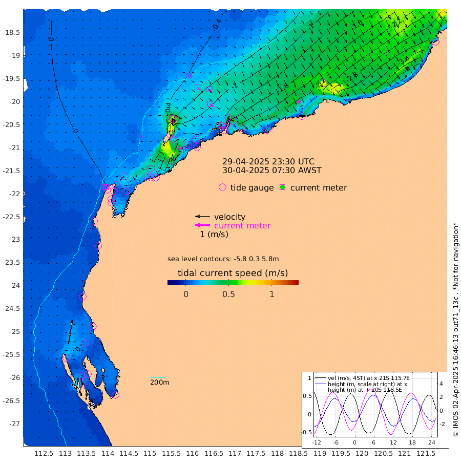 9cm/s 92T +12cm/s rms + 5cm/s -173T. NWSBAR 206m 8cm/s 39T +22cm/s rms + 10cm/s -148T. TAN100 109m 11cm/s 108T +11cm/s rms + 8cm/s -129T. PIL200 208m 22cm/s 133T +13cm/s rms + 7cm/s -137T. PIL100 105m 26cm/s 138T +12cm/s rms + 2cm/s -92T. PIL050 55m 9cm/s 50T +18cm/s rms + 4cm/s -149T. NRSNIN 61m 24cm/s 139T +6cm/s rms + 3cm/s 112T. NW Shelf M6 65m 5cm Withnell Point -3cm Denham -2cm Shark Bay (Inr Bn) 0cm Shark Bay -1cm Useless Loop -1cm Hamelin Pool -1cm Carnarvon 15cm Cape Cuvier 14cm Coral Bay 9cm Norwegian Bay -60cm Badjirrajirra 4cm Tantabiddi -29cm Point Murat -47cm Exmouth -61cm Learmonth -37cm Y Island -12cm North Muiron Island -23cm Roller -28cm Ashburton North -39cm Onslow (Beadon Creek) -30cm Thevenard Island -103cm Large Island -122cm North Sandy Island -70cm Barrow Island (Wapet Landing) -123cm Barrow Island (Tanker Mooring) -104cm Withnell Bay -71cm Trimouille Island -42cm North West Island -130cm Fortescue Road -106cm Steamboat Island -131cm Sholl Island -104cm Fairway Beacon -102cm Mawby Island -105cm Dampier (King Bay) -99cm Cape Legendre -137cm Hauy Island -150cm Port Walcott (Cape Lambert) -171cm Depuch Island -194cm Port Hedland -178cm Bedout Island -228cm Lagrange Bay