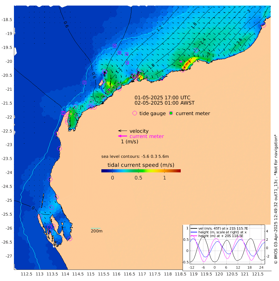 5cm/s -8T +12cm/s rms + 5cm/s -173T. NWSBAR 206m 4cm/s 50T +22cm/s rms + 10cm/s -148T. TAN100 109m 7cm/s 100T +11cm/s rms + 8cm/s -129T. PIL200 208m 10cm/s 112T +13cm/s rms + 7cm/s -137T. PIL100 105m 12cm/s 113T +12cm/s rms + 2cm/s -92T. PIL050 55m 4cm/s 48T +18cm/s rms + 4cm/s -149T. NRSNIN 61m 15cm/s 117T +6cm/s rms + 3cm/s 112T. NW Shelf M6 65m -12cm Withnell Point -35cm Denham -36cm Shark Bay (Inr Bn) -36cm Shark Bay -45cm Useless Loop -14cm Hamelin Pool 11cm Carnarvon 11cm Cape Cuvier 14cm Coral Bay 19cm Norwegian Bay 65cm Badjirrajirra 23cm Tantabiddi 42cm Point Murat 53cm Exmouth 70cm Learmonth 53cm Y Island 36cm North Muiron Island 48cm Roller 54cm Ashburton North 60cm Onslow (Beadon Creek) 56cm Thevenard Island 92cm Large Island 123cm North Sandy Island 89cm Barrow Island (Wapet Landing) 116cm Barrow Island (Tanker Mooring) 138cm Withnell Bay 93cm Trimouille Island 63cm North West Island 119cm Fortescue Road 131cm Steamboat Island 143cm Sholl Island 136cm Fairway Beacon 137cm Mawby Island 140cm Dampier (King Bay) 138cm Cape Legendre 155cm Hauy Island 179cm Port Walcott (Cape Lambert) 192cm Depuch Island 230cm Port Hedland 225cm Bedout Island 324cm Lagrange Bay