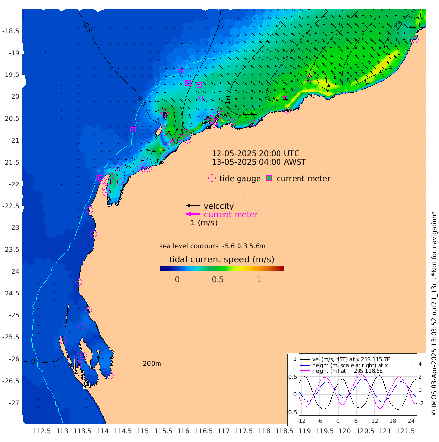 5cm/s -157T +12cm/s rms + 5cm/s -173T. NWSBAR 206m 3cm/s -137T +22cm/s rms + 10cm/s -148T. TAN100 109m 10cm/s -70T +11cm/s rms + 8cm/s -129T. PIL200 208m 16cm/s -57T +13cm/s rms + 7cm/s -137T. PIL100 105m 20cm/s -56T +12cm/s rms + 2cm/s -92T. PIL050 55m 3cm/s -135T +18cm/s rms + 4cm/s -149T. NRSNIN 61m 25cm/s -66T +6cm/s rms + 3cm/s 112T. NW Shelf M6 65m -3cm Withnell Point 0cm Denham -1cm Shark Bay (Inr Bn) -3cm Shark Bay -2cm Useless Loop -3cm Hamelin Pool -11cm Carnarvon -12cm Cape Cuvier -16cm Coral Bay -16cm Norwegian Bay -42cm Badjirrajirra -23cm Tantabiddi -31cm Point Murat -37cm Exmouth -43cm Learmonth -44cm Y Island -32cm North Muiron Island -43cm Roller -44cm Ashburton North -46cm Onslow (Beadon Creek) -46cm Thevenard Island -48cm Large Island -75cm North Sandy Island -63cm Barrow Island (Wapet Landing) -69cm Barrow Island (Tanker Mooring) -103cm Withnell Bay -48cm Trimouille Island -55cm North West Island -78cm Fortescue Road -90cm Steamboat Island -76cm Sholl Island -99cm Fairway Beacon -104cm Mawby Island -102cm Dampier (King Bay) -100cm Cape Legendre -105cm Hauy Island -126cm Port Walcott (Cape Lambert) -140cm Depuch Island -163cm Port Hedland -180cm Bedout Island -282cm Lagrange Bay