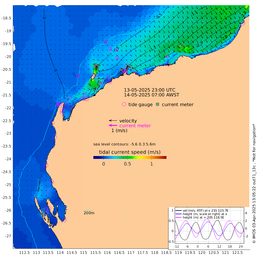 7cm/s 89T +12cm/s rms + 5cm/s -173T. NWSBAR 206m 7cm/s 39T +22cm/s rms + 10cm/s -148T. TAN100 109m 9cm/s 106T +11cm/s rms + 8cm/s -129T. PIL200 208m 17cm/s 132T +13cm/s rms + 7cm/s -137T. PIL100 105m 20cm/s 136T +12cm/s rms + 2cm/s -92T. PIL050 55m 7cm/s 50T +18cm/s rms + 4cm/s -149T. NRSNIN 61m 17cm/s 147T +6cm/s rms + 3cm/s 112T. NW Shelf M6 65m 10cm Withnell Point 3cm Denham 3cm Shark Bay (Inr Bn) 5cm Shark Bay 3cm Useless Loop -3cm Hamelin Pool 7cm Carnarvon 18cm Cape Cuvier 16cm Coral Bay 14cm Norwegian Bay -39cm Badjirrajirra 9cm Tantabiddi -15cm Point Murat -29cm Exmouth -44cm Learmonth -21cm Y Island -3cm North Muiron Island -12cm Roller -16cm Ashburton North -23cm Onslow (Beadon Creek) -17cm Thevenard Island -100cm Large Island -89cm North Sandy Island -48cm Barrow Island (Wapet Landing) -89cm Barrow Island (Tanker Mooring) -72cm Withnell Bay -41cm Trimouille Island -30cm North West Island -127cm Fortescue Road -67cm Steamboat Island -92cm Sholl Island -73cm Fairway Beacon -74cm Mawby Island -75cm Dampier (King Bay) -64cm Cape Legendre -98cm Hauy Island -109cm Port Walcott (Cape Lambert) -124cm Depuch Island -144cm Port Hedland -128cm Bedout Island -238cm Lagrange Bay