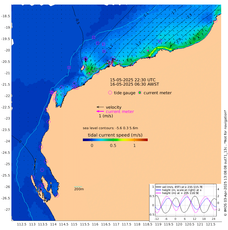 4cm/s 139T +12cm/s rms + 5cm/s -173T. NWSBAR 206m 2cm/s 40T +22cm/s rms + 10cm/s -148T. TAN100 109m 3cm/s -72T +11cm/s rms + 8cm/s -129T. PIL200 208m 2cm/s -104T +13cm/s rms + 7cm/s -137T. PIL100 105m 5cm/s -97T +12cm/s rms + 2cm/s -92T. PIL050 55m 2cm/s 48T +18cm/s rms + 4cm/s -149T. NRSNIN 61m 10cm/s -91T +6cm/s rms + 3cm/s 112T. NW Shelf M6 65m 2cm Withnell Point 1cm Denham -1cm Shark Bay (Inr Bn) 1cm Shark Bay -1cm Useless Loop -5cm Hamelin Pool -5cm Carnarvon 1cm Cape Cuvier -3cm Coral Bay -5cm Norwegian Bay -52cm Badjirrajirra -11cm Tantabiddi -31cm Point Murat -43cm Exmouth -55cm Learmonth -44cm Y Island -25cm North Muiron Island -38cm Roller -39cm Ashburton North -45cm Onslow (Beadon Creek) -41cm Thevenard Island -96cm Large Island -102cm North Sandy Island -70cm Barrow Island (Wapet Landing) -98cm Barrow Island (Tanker Mooring) -110cm Withnell Bay -65cm Trimouille Island -50cm North West Island -125cm Fortescue Road -98cm Steamboat Island -108cm Sholl Island -108cm Fairway Beacon -110cm Mawby Island -110cm Dampier (King Bay) -104cm Cape Legendre -125cm Hauy Island -145cm Port Walcott (Cape Lambert) -163cm Depuch Island -189cm Port Hedland -191cm Bedout Island -335cm Lagrange Bay