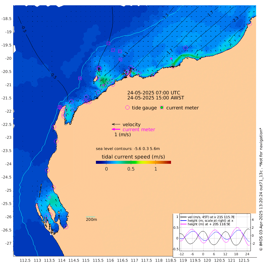 5cm/s 113T +12cm/s rms + 5cm/s -173T. NWSBAR 206m 3cm/s -139T +22cm/s rms + 10cm/s -148T. TAN100 109m 1cm/s -138T +11cm/s rms + 8cm/s -129T. PIL200 208m 5cm/s -99T +13cm/s rms + 7cm/s -137T. PIL100 105m 7cm/s -101T +12cm/s rms + 2cm/s -92T. PIL050 55m 3cm/s -142T +18cm/s rms + 4cm/s -149T. NRSNIN 61m 7cm/s -90T +6cm/s rms + 3cm/s 112T. NW Shelf M6 65m -34cm Withnell Point -19cm Denham -16cm Shark Bay (Inr Bn) -17cm Shark Bay -4cm Useless Loop 20cm Hamelin Pool -50cm Carnarvon -39cm Cape Cuvier -40cm Coral Bay -45cm Norwegian Bay -79cm Badjirrajirra -47cm Tantabiddi -62cm Point Murat -71cm Exmouth -83cm Learmonth -68cm Y Island -56cm North Muiron Island -66cm Roller -68cm Ashburton North -73cm Onslow (Beadon Creek) -71cm Thevenard Island -70cm Large Island -118cm North Sandy Island -94cm Barrow Island (Wapet Landing) -115cm Barrow Island (Tanker Mooring) -128cm Withnell Bay -95cm Trimouille Island -77cm North West Island -82cm Fortescue Road -124cm Steamboat Island -110cm Sholl Island -125cm Fairway Beacon -126cm Mawby Island -127cm Dampier (King Bay) -136cm Cape Legendre -138cm Hauy Island -153cm Port Walcott (Cape Lambert) -179cm Depuch Island -185cm Port Hedland -160cm Bedout Island -208cm Lagrange Bay